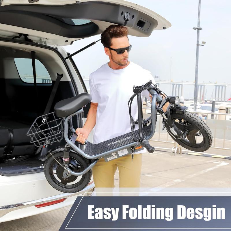 ¡ăSmart Electric Scooter with Seată The Caroma P5 is an electric commuter scooter designed for adults. It has a basket above the rear wheels and can carry up to 30 pounds, making it ideal for quick errands and shopping. This electric scooter also features an LCD display that clearly shows the real-time power level of the ride. Meanwhile, the handle-mounted throttle allows you to control your riding speed easily and precisely.