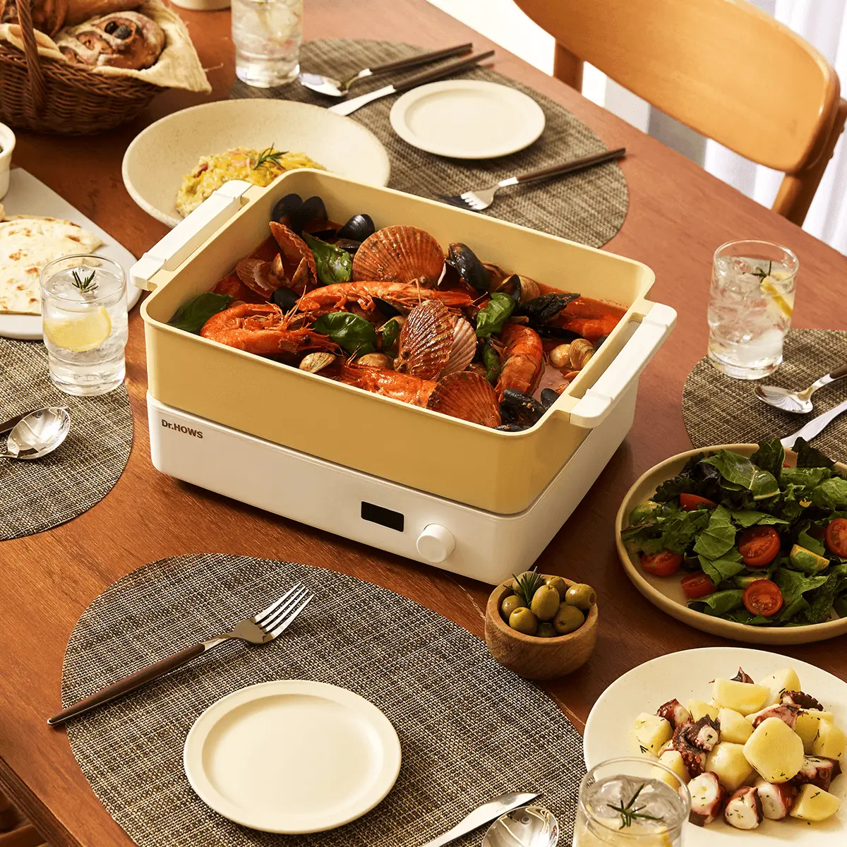 5. Dr.Hows Doran Doran 3 in 1 Electric Skillet Multi Cooker Hot Pot Fryer Pan Griddle and Grill with Glass Lid Yellow