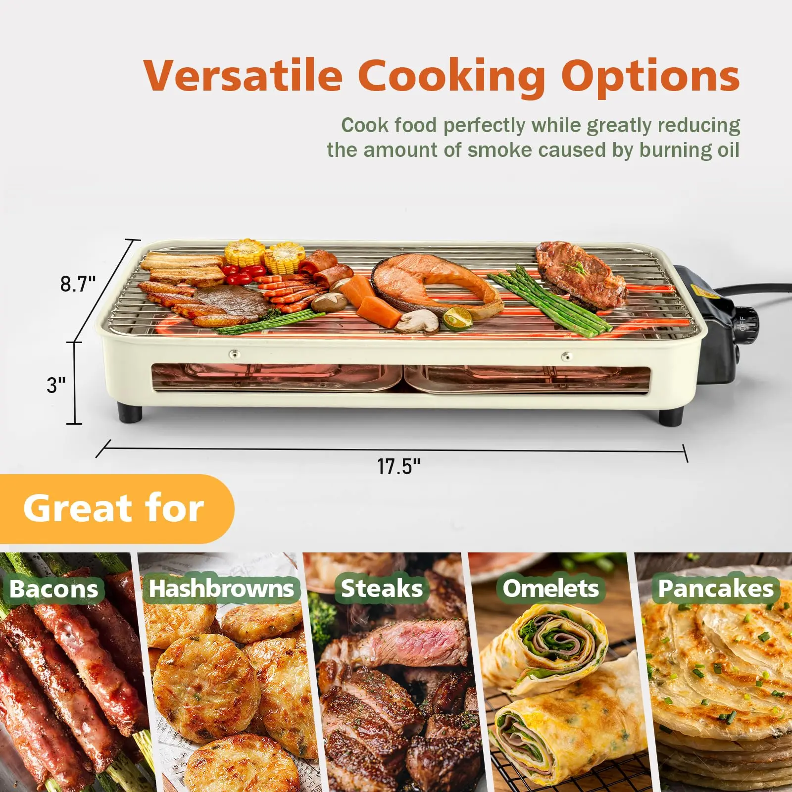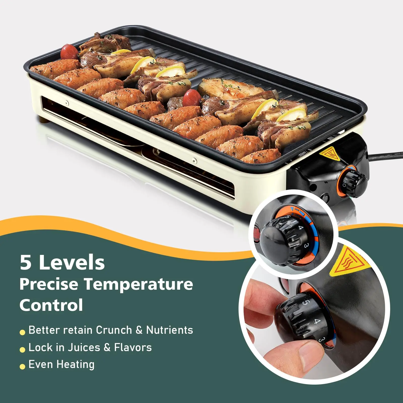 ·【NON-STICK Coating, Smokeless & Easy to Clean】Our electric grill features a NON-STICK coated operating surface provides No-Scour Cleaning. The coated tray provides instant food release using little to no oil and therefore produce little smoke. Removable cooking parts are all Dishwasher Safe, greatly reducing cleanup time.