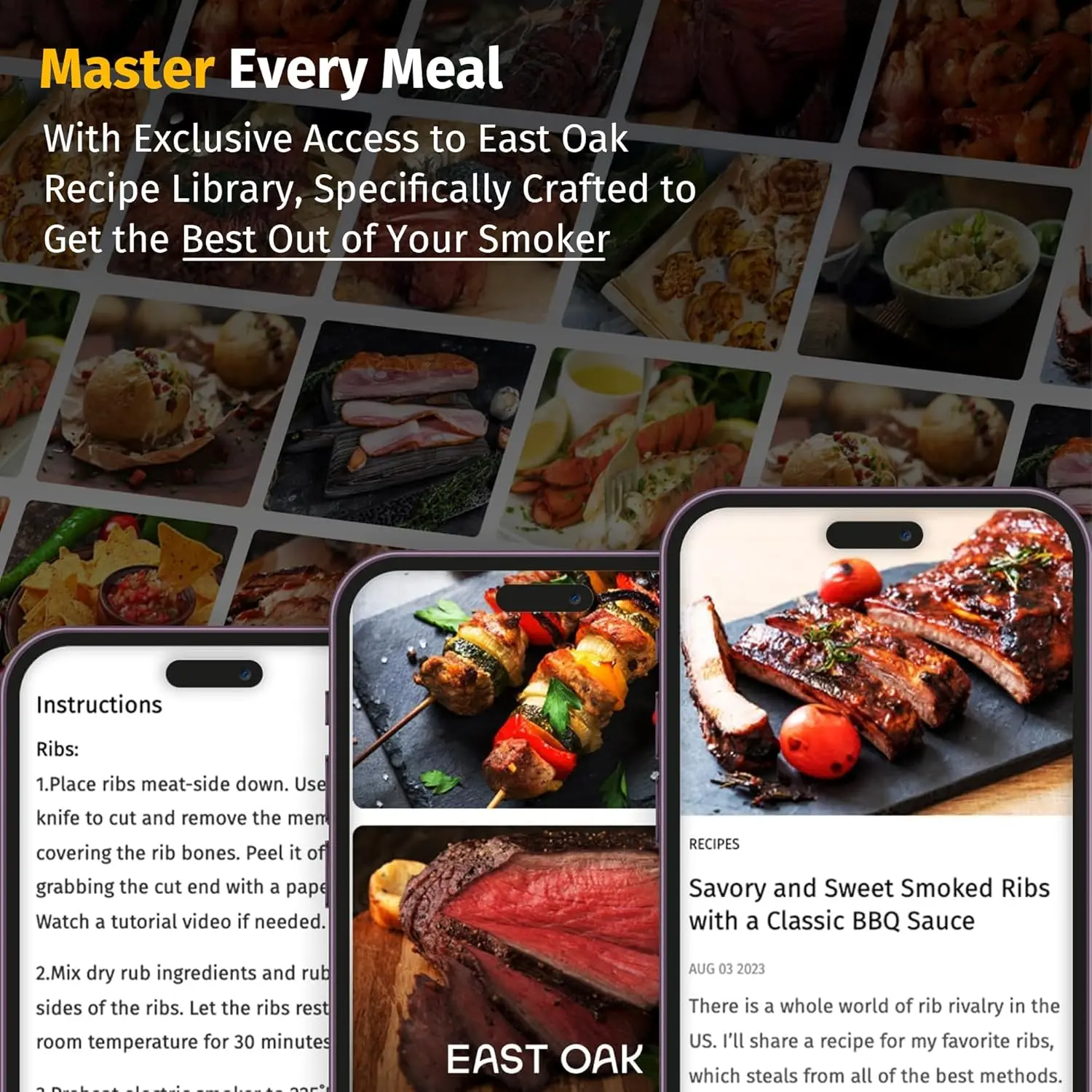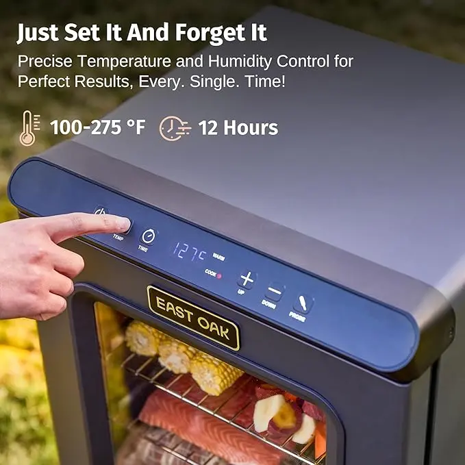 The 800W power heating tube in the electric smoker creates consistent smoke from wood chips, guaranteeing tender, juicy meats through low and slow cooking. Follow EAST OAK's website for more delectable recipes