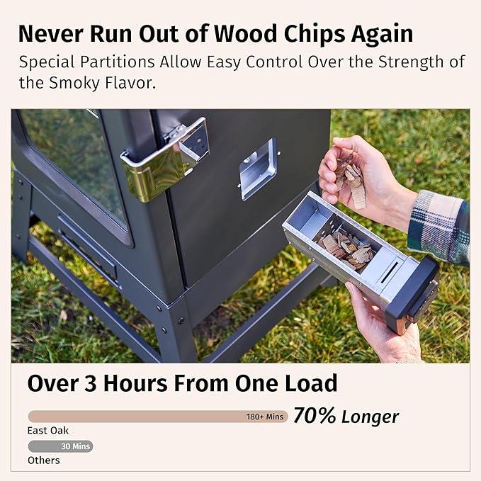 The smoker features a side wood chip loader for continuous smoking for 2-3 hours without opening the door and adding chips, preserving the internal heat, and locking in the smoked flavors
