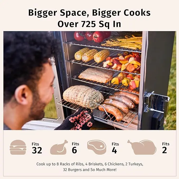 The outdoor smoker features a digital control panel for monitoring internal temperature and time. With a temperature range of 100-275°F and a maximum timer setting of 12 hours, operations are swift and cooking is hassle-free