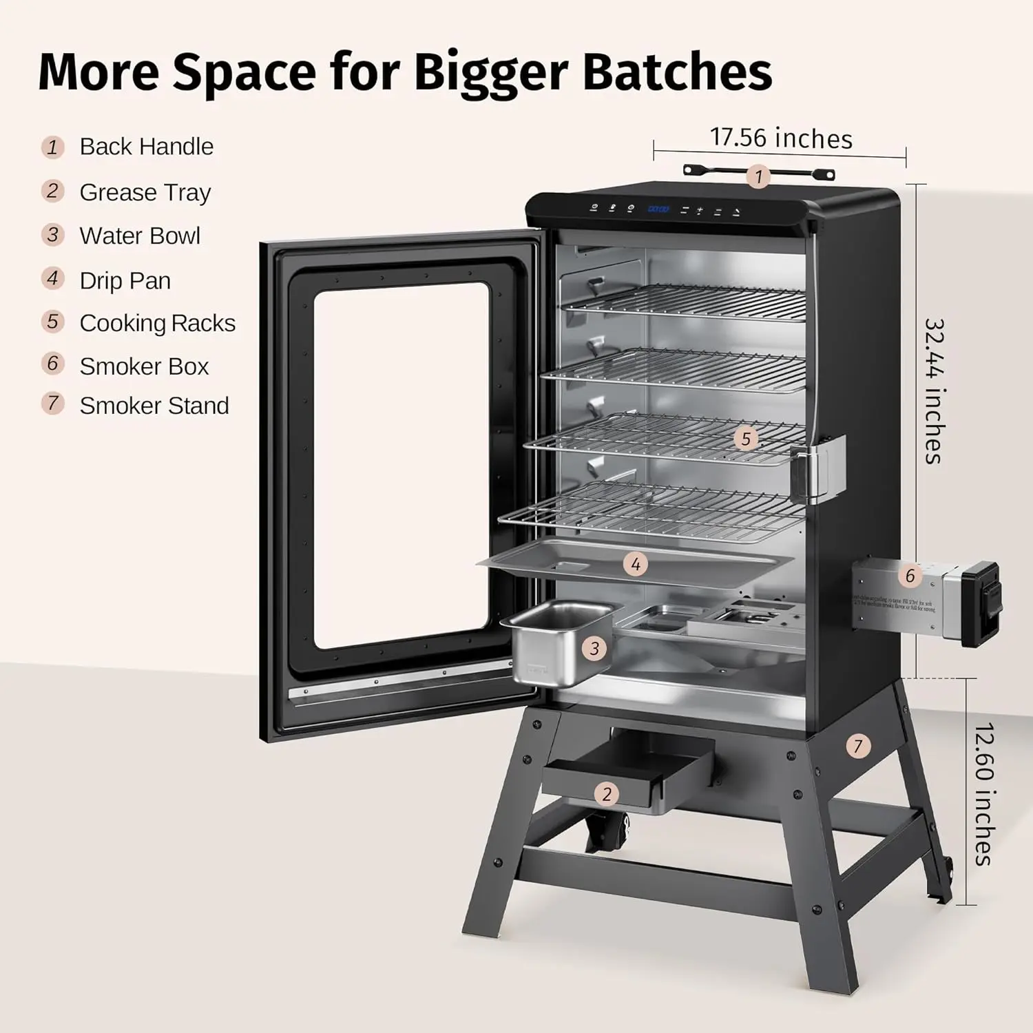 The 30-inch digital electric smoker measures 18.97"x 17.56" x 45.04" and comes with 4 removable chrome-plated smoking racks. It's recommended to place meats on the lower racks and vegetables on the upper racks