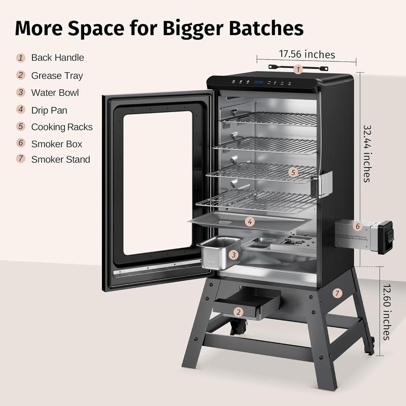 The visual glass door allows you to directly observe the food in the smoker. The meat probe detects food temperature and keeps track of smoking progress and heat in real-time