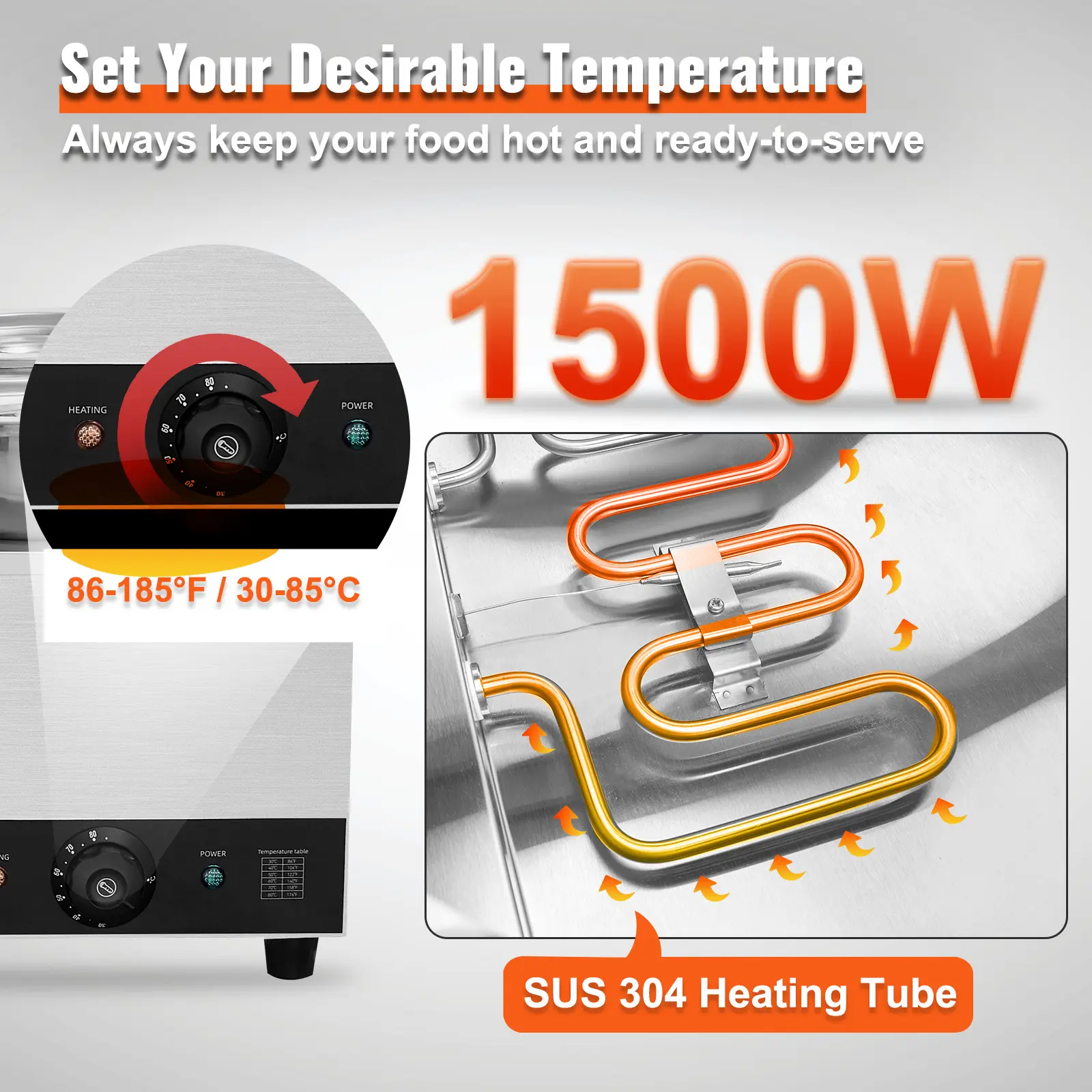 • Fast Heating, Lasting Warmth: This impressive food warmer comes with a powerful 1500-watt SUS 304 stainless steel heating tube that rapidly warms up your food to maintain its hot and delicious flavors. You can adjust the temperature output to suit your preference, ranging from 86 to 185 degrees Fahrenheit, thanks to the temperature controller.