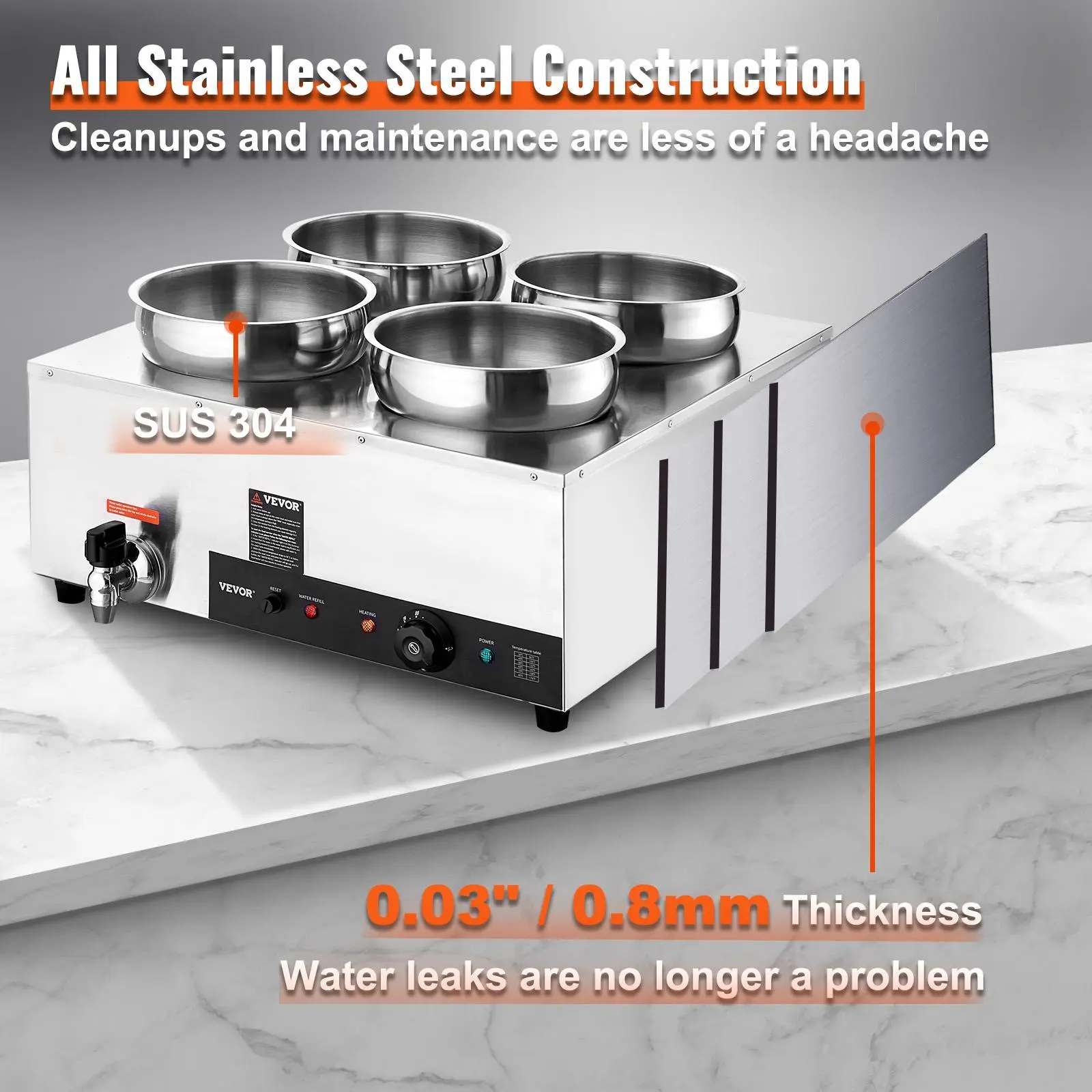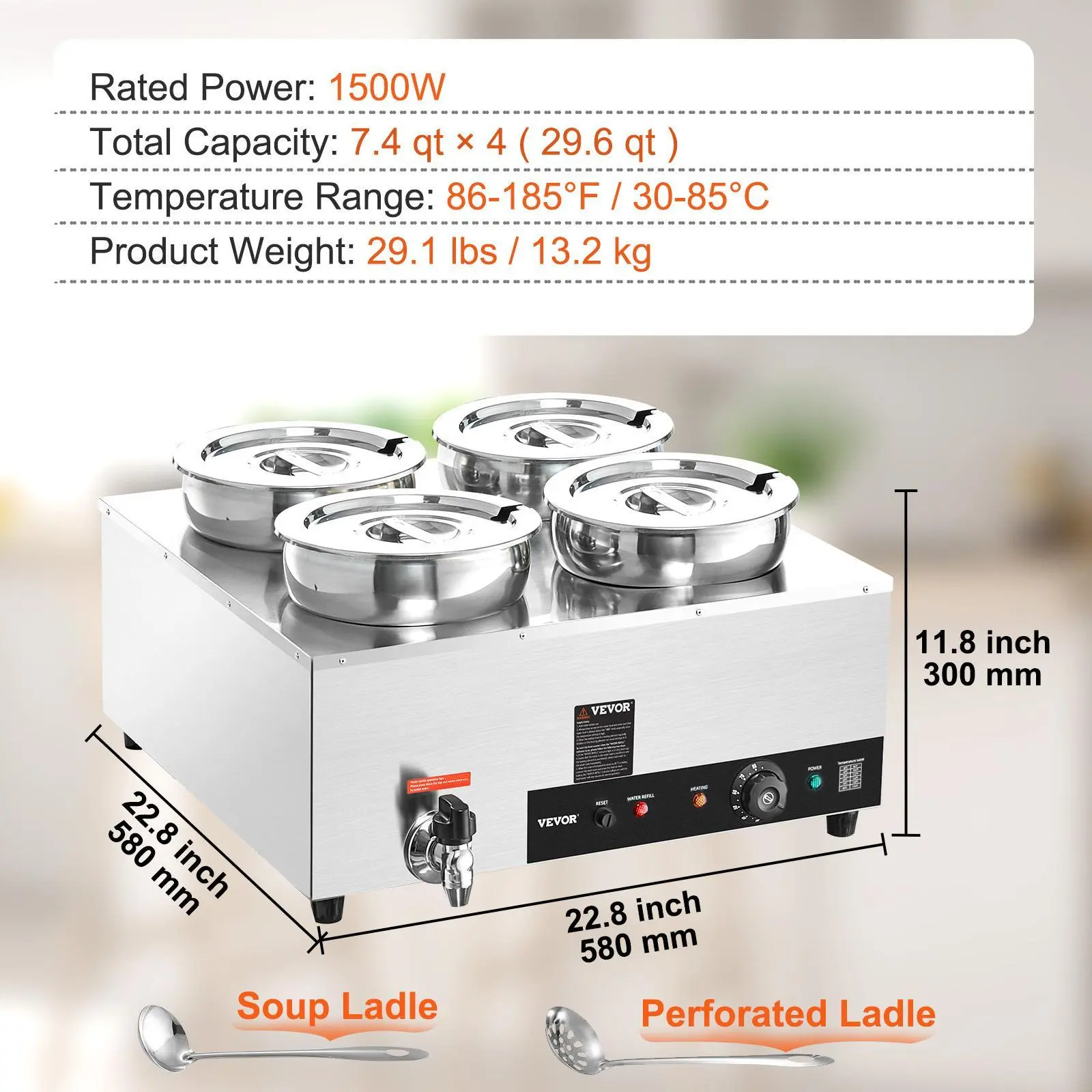 • Includes Four 7.4Qt Soup Pots: Our commercial soup warmer comes equipped with four 7.4Qt round pots (each 8.7" deep) accompanied by their respective lids, allowing you to serve four different dishes simultaneously. Feel free to change up your menu from soups and sauces to stew, or even nacho cheese and chocolate.
