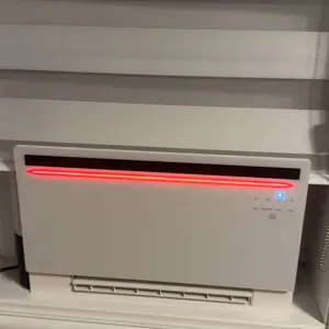 This wall mounted space heater does way more than heat! smart app, control, RGB lights, Bluetooth speaker and a summer fan mode all in one sleek set up perfect for apartments, bedrooms, and modern spaces #spaceheater #wallmountedheater #hightech #spacesaving #smallspaceliving