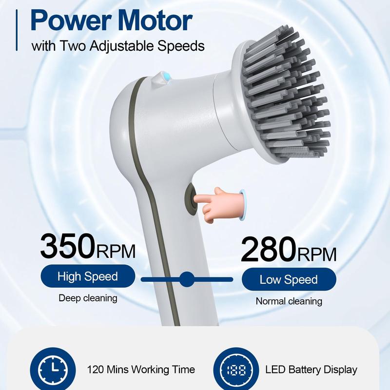 γVersatile Brush Heads & Dual SpeedsγMade from lightweight ABS material, this scrubber is easy to carry and operate. It includes 4 specialized brush heads for different cleaning tasks. Two adjustable speeds offer splash-free, efficient cleaning on low speed and powerful stain removal on high speed.