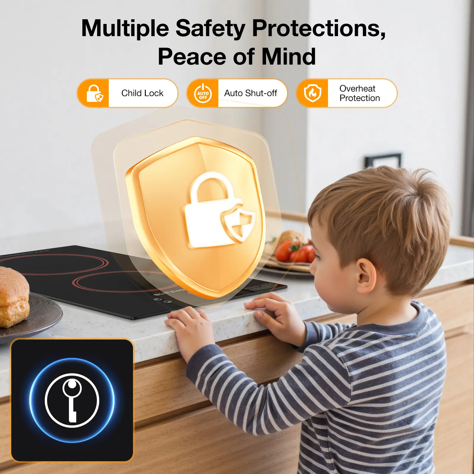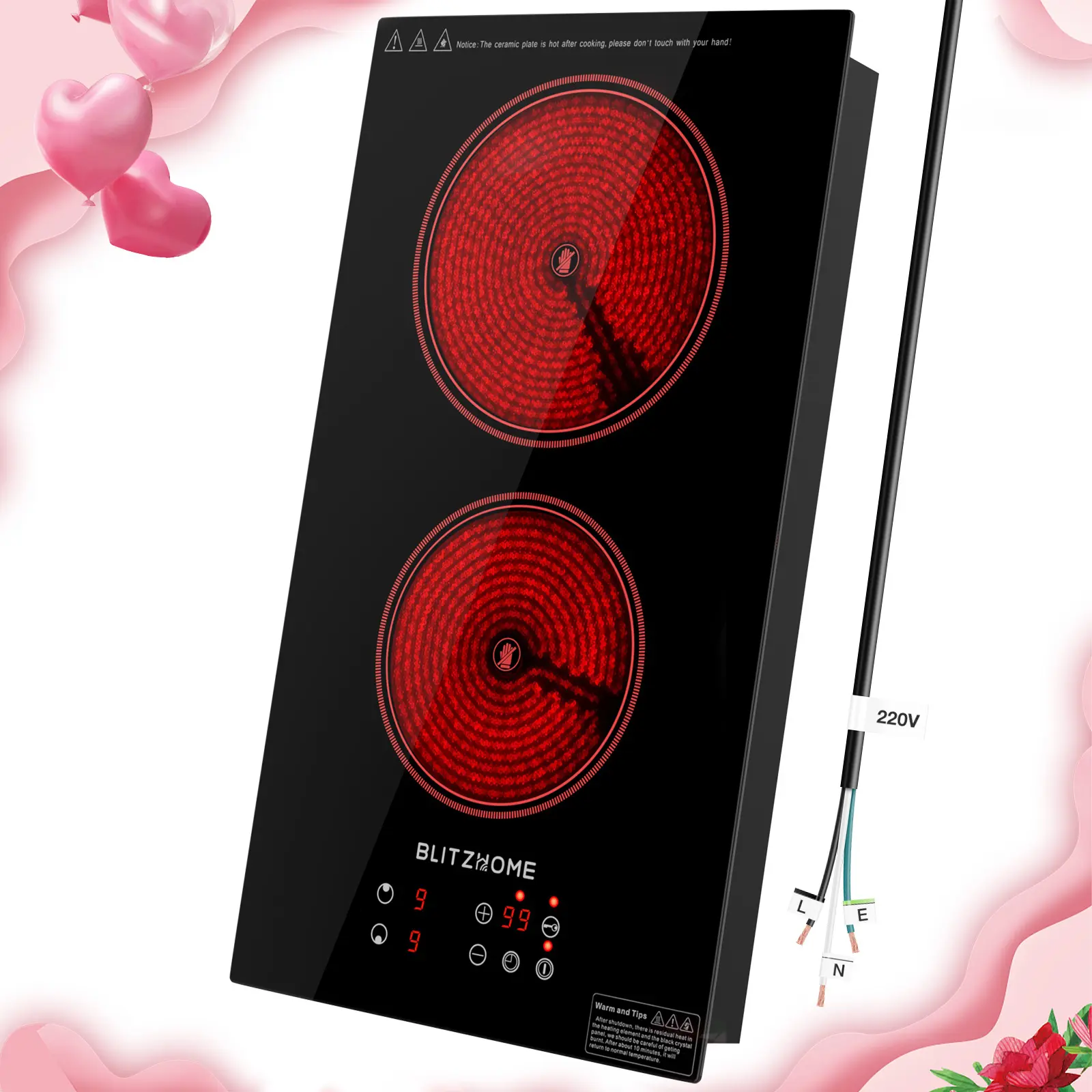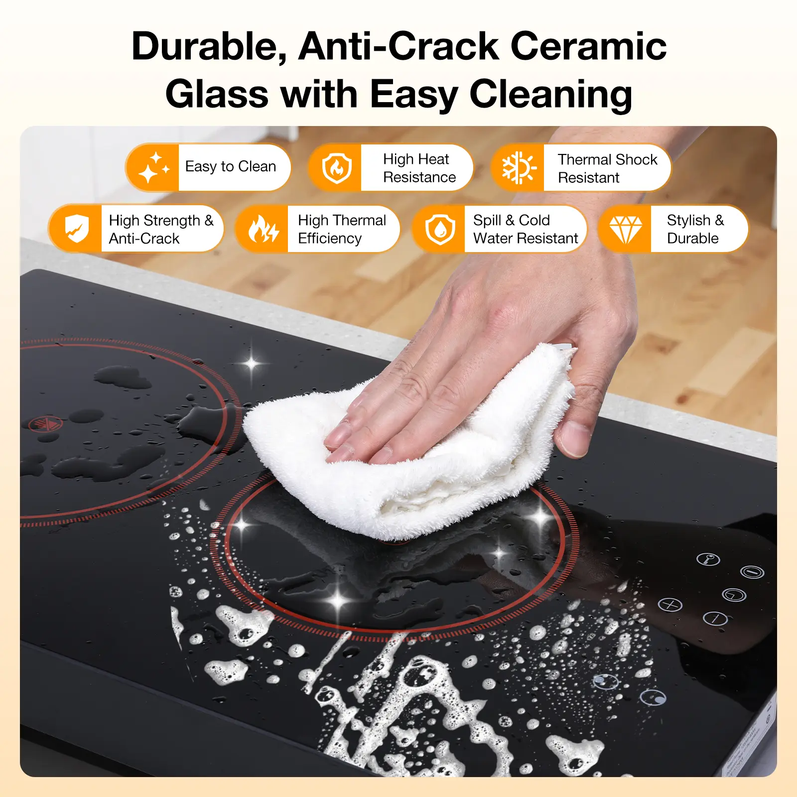 ·Easy-to-Clean Glass Surface: Maintain a spotless electric cooktop with stylish, durable, high-quality glass. No raised knobs ensure effortless cleaning. Tips: If sugary spills occur, use a scraper immediately to avoid marks. Keep the pan and surface dry before heating