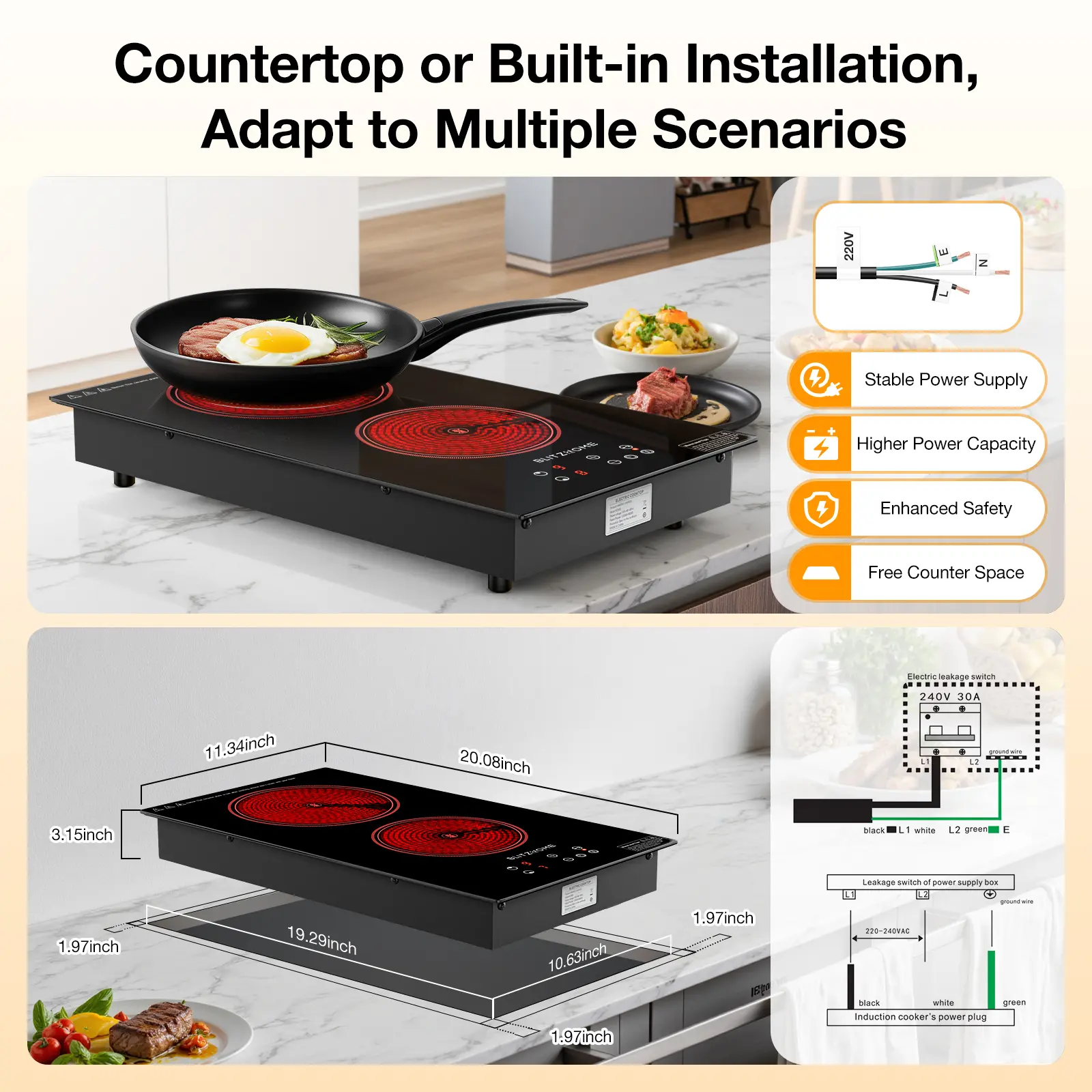 ·220-240V Electric Cooktop: Flexible installation as built-in or countertop, requiring professional hard wiring (no plug). Provides stable power, higher power capacity, and safety. Product Size: 20.08" x 11.34" x 3.15" (510*288*80mm); Cut-out Size: 10.63" x 19.29" (270*490mm). Includes 4 non-slip stands for stability