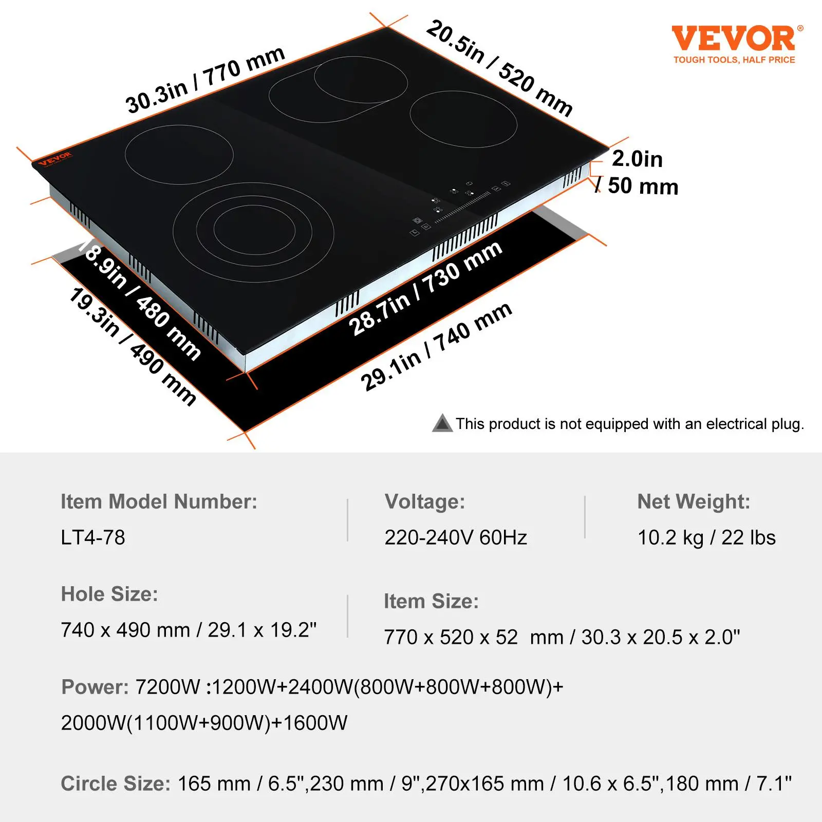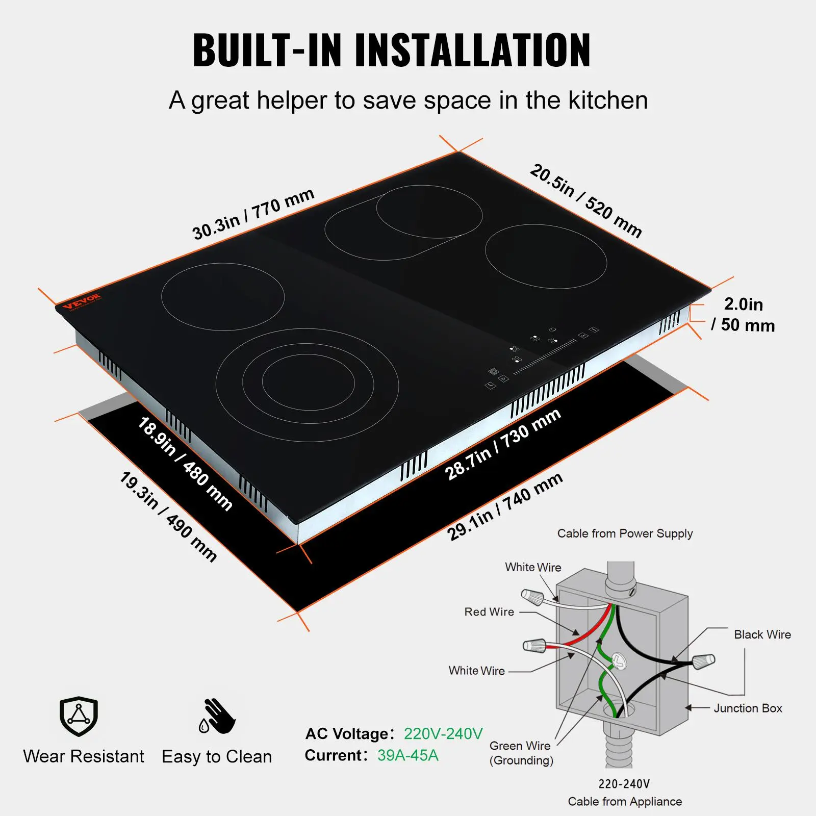 • Built-in Design: With the 29.1x19.2-inch cutout size, this 30.3x20.5 inch cooktop adopts a built-in design, convenient for you to install and saves your kitchen space. Suitable for voltages of 220-240V, 60Hz.