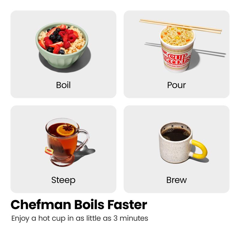 ·FAST BOILING: Chefman kettles boil water faster! Boil your water in as little as 3 minutes for tea, hot chocolate, pour-over coffee, and other hot beverages.