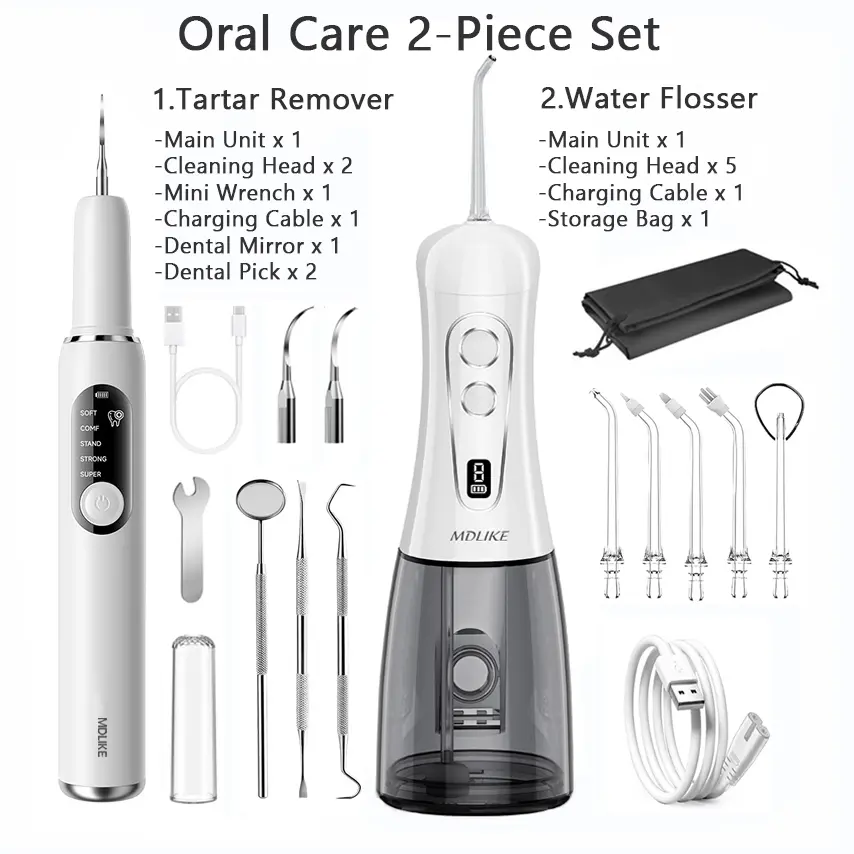 In addition to the tartar remover, we also offer a complete oral care set that includes both a tartar remover and a water flosser. The water flosser delivers high water pressure pulses at 1300 times per minute, effectively removing plaque for deep cleaning.