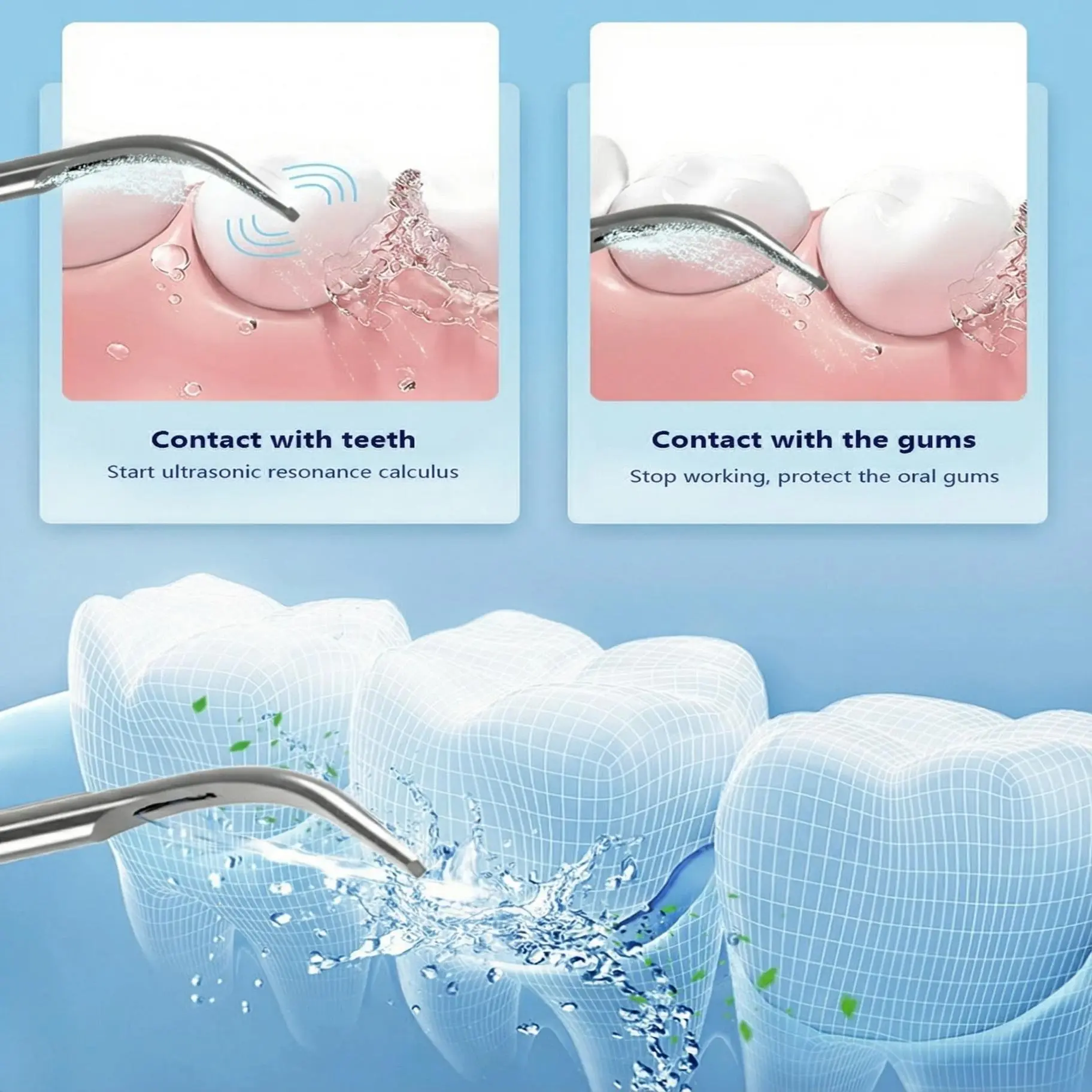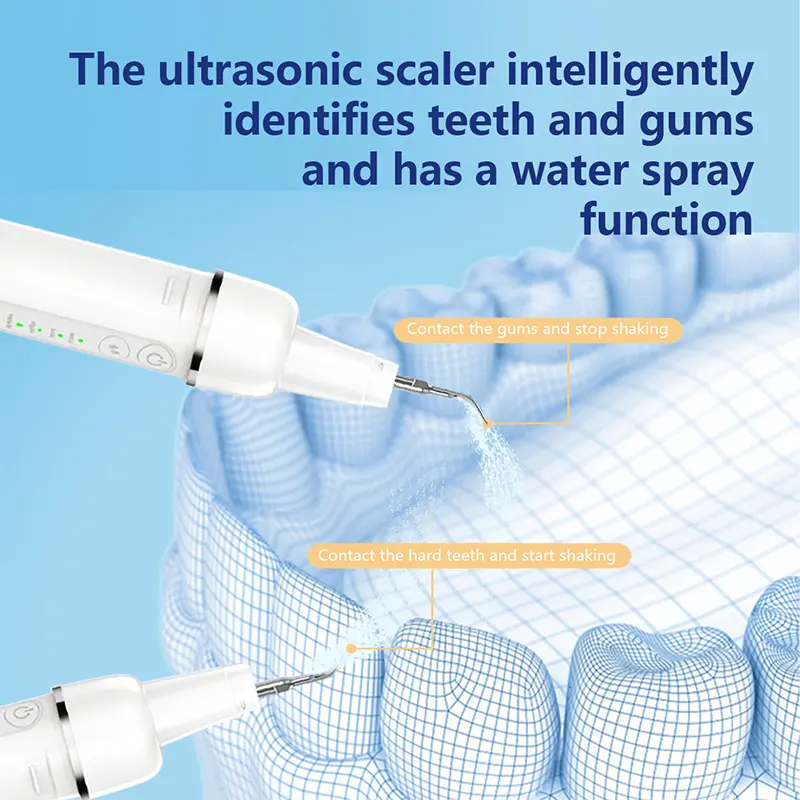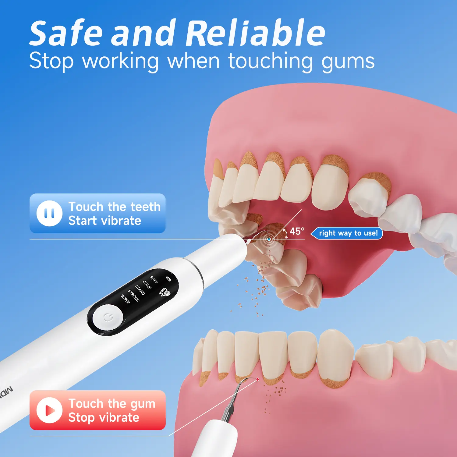 The device vibrates only when in contact with teeth or hard surfaces and automatically stops when touching gums or soft tissue, ensuring safe and comfortable use.