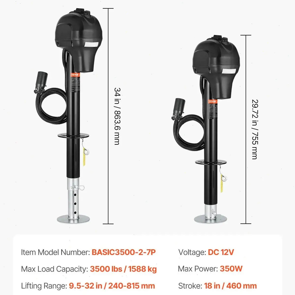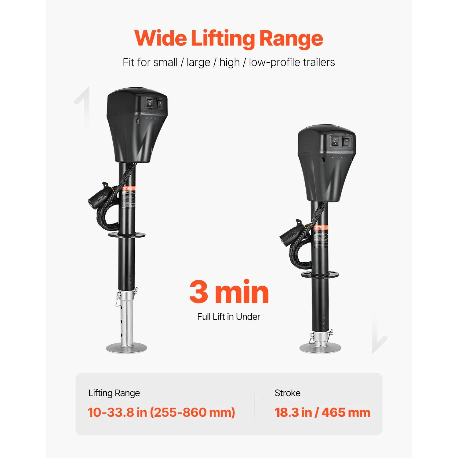 • Heavy-Duty Load Capacity: The VEVOR electric trailer jack boasts an impressive lifting capacity of 5000 lbs and a lifting range of 10 to 33.8 inches.