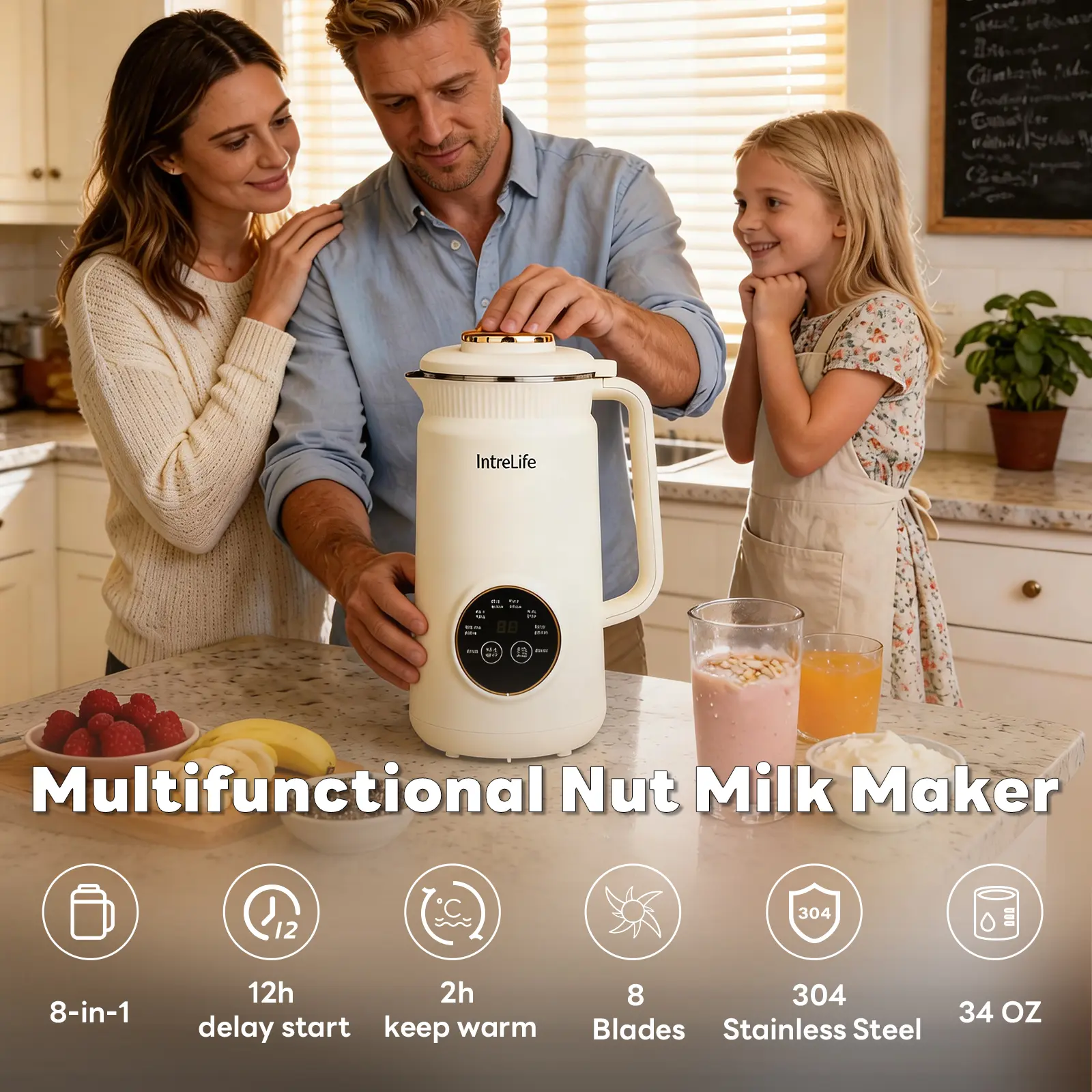 Features a powerful motor and 8 durable stainless steel blades that quickly blend and strain nuts to create a smooth, creamy milk with no grit or pulp.