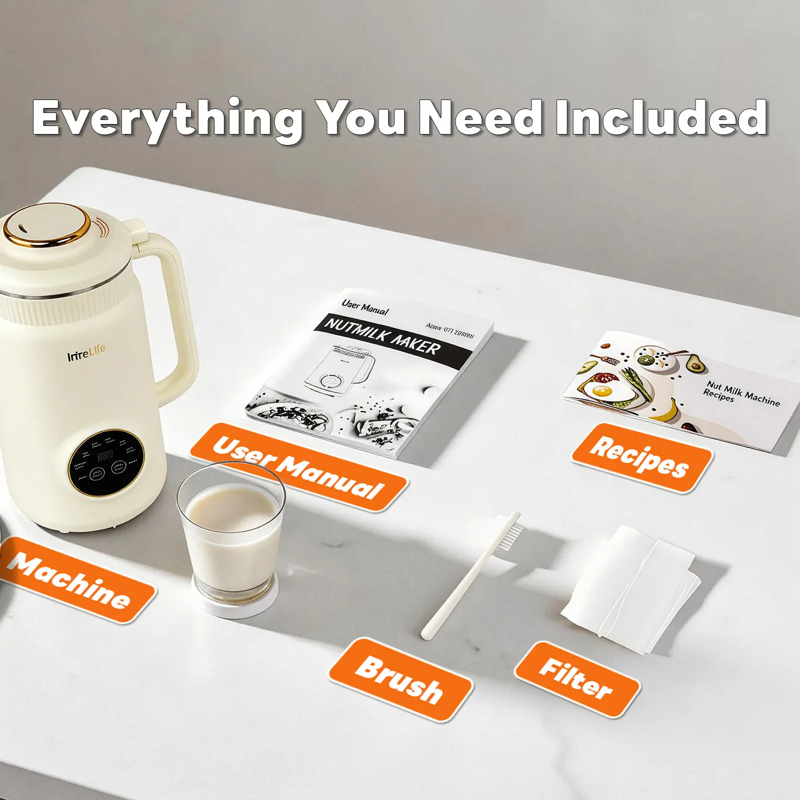 Machine + Cleaning Brush + Filter + Recipe Guide. Everything you need to start making fresh, homemade nut milk right out of the box.