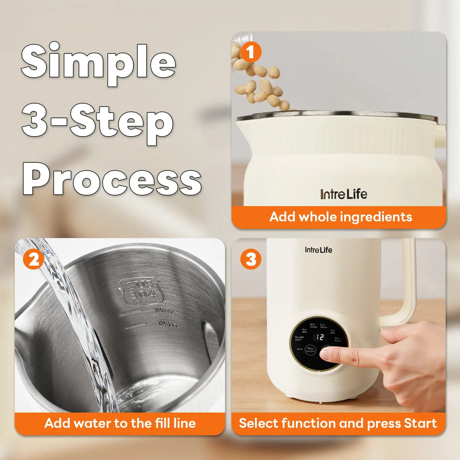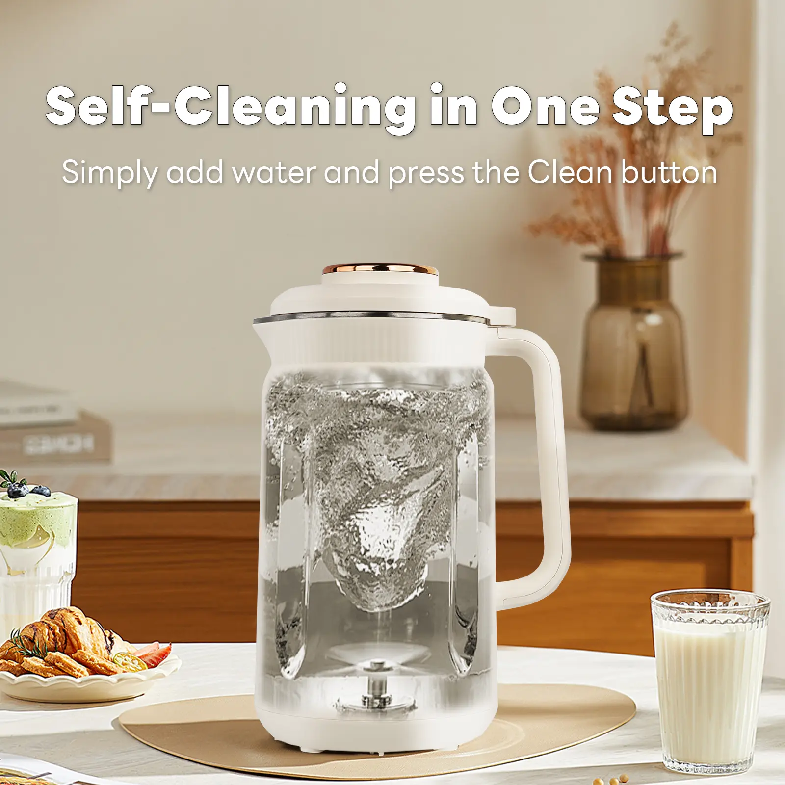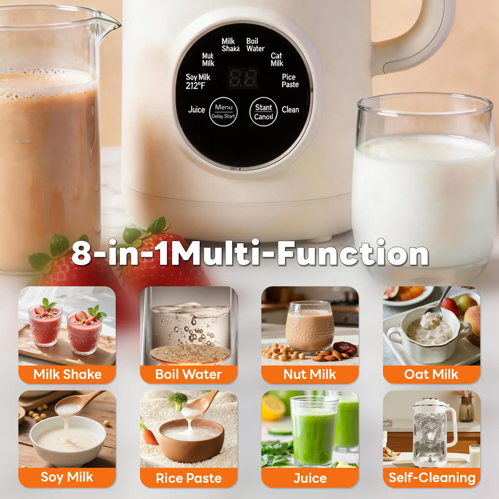 Featuring 8 preset modes to meet your daily needs: Milk Shake, Boil Water, Nut Milk, Oat Milk, Soy Milk, Rice Paste, Juice, and Clean.