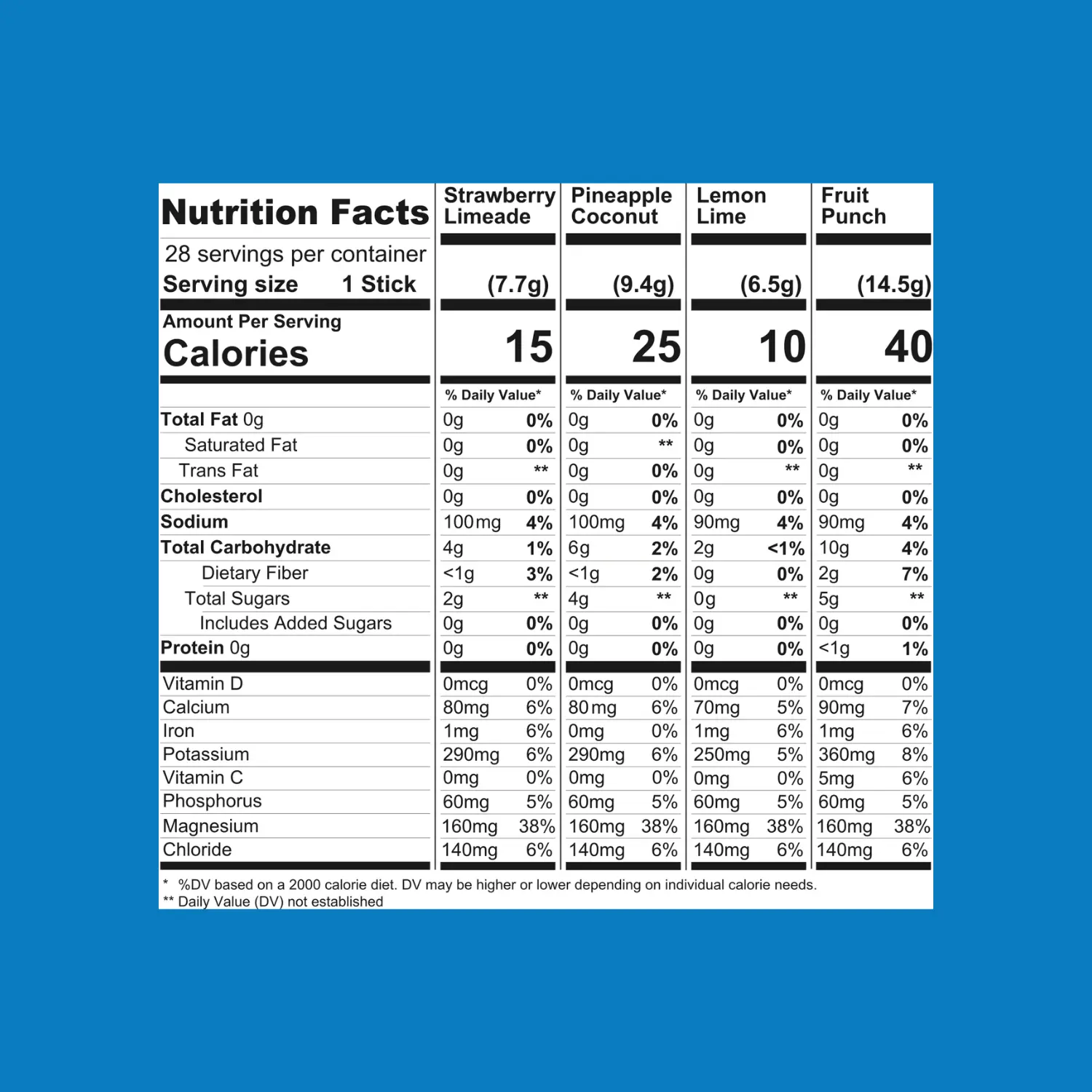 Lemon Lime: Lemon Juice Powder, Non-GMO Citric Acid, Magnesium Citrate (Electrolyte), Potassium Citrate (Electrolyte), Lemon Extract, Dicalcium Phosphate Anhydrous (Electrolyte), Unrefined Sea Salt (Electrolyte), Lime Extract, Organic Stevia Leaf Extract