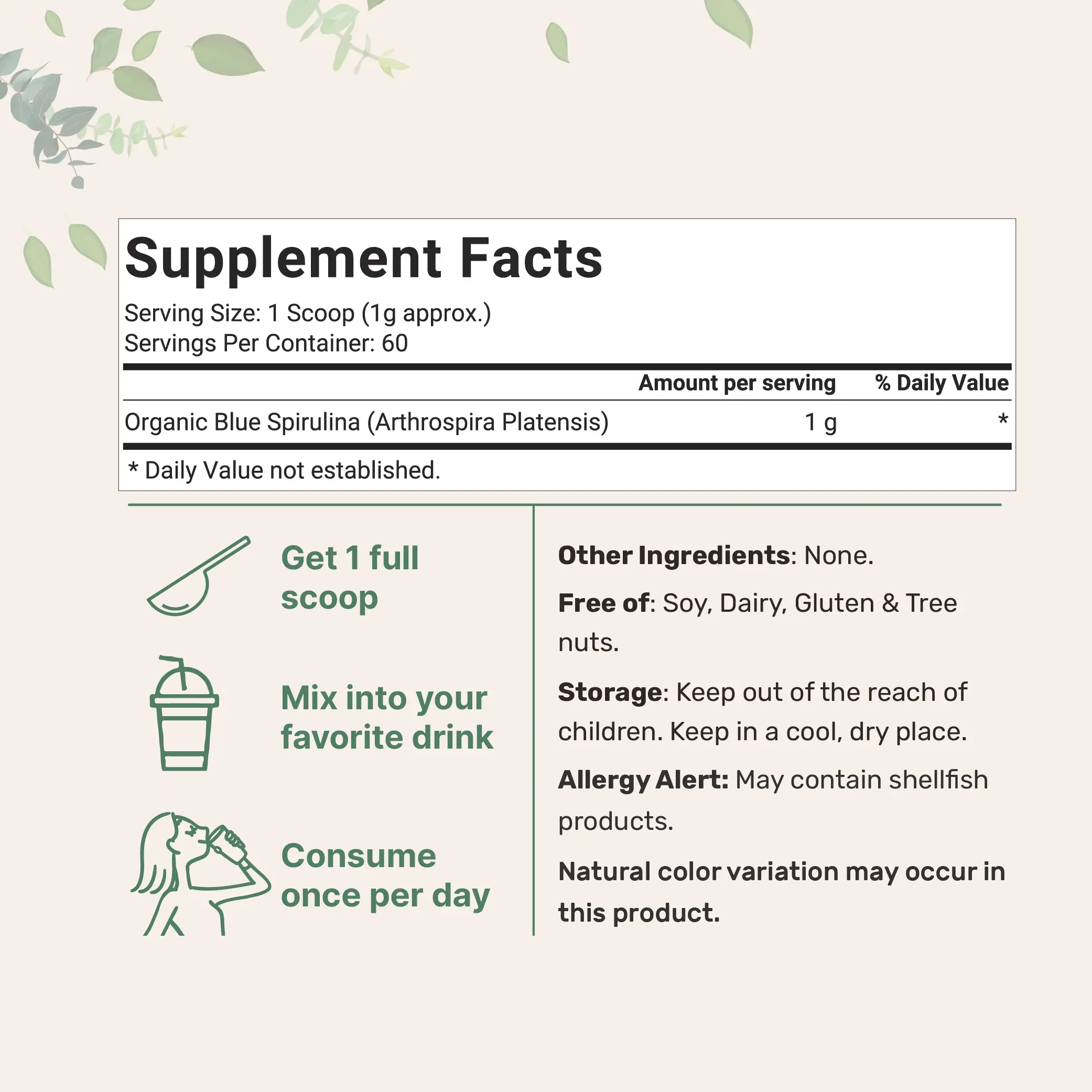 ·A nutrient-dense and potent food-grade spirulina powder for shakes, acai bowls, and baked goods that won’t cause a fishy smell. Each pouch offers 60 grams of potent blue-spirulina. Equaling 60 total servings of 1 gram per scoop. The ultimate green superfood powder that is possibly one of the most nutrient-dense foods in the world.