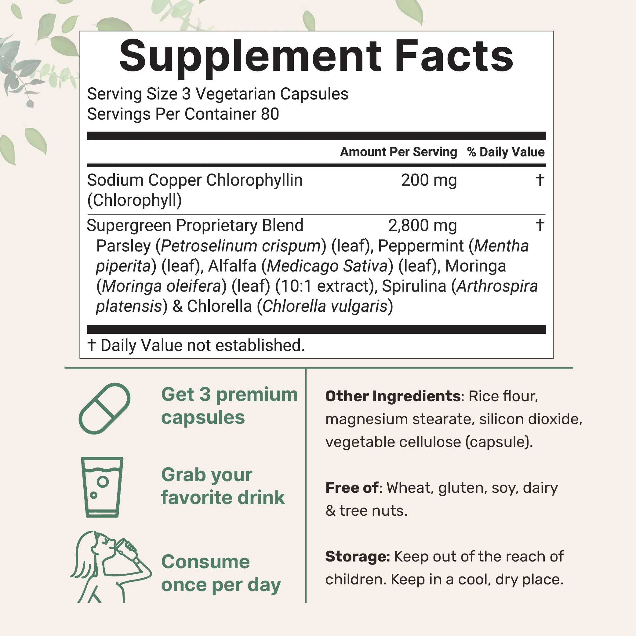·Includes highly bioavailable sodium copper chlorophyllin, a stabilized form of chlorophyll enhanced with copper to support better absorption and minimize nutrient loss.