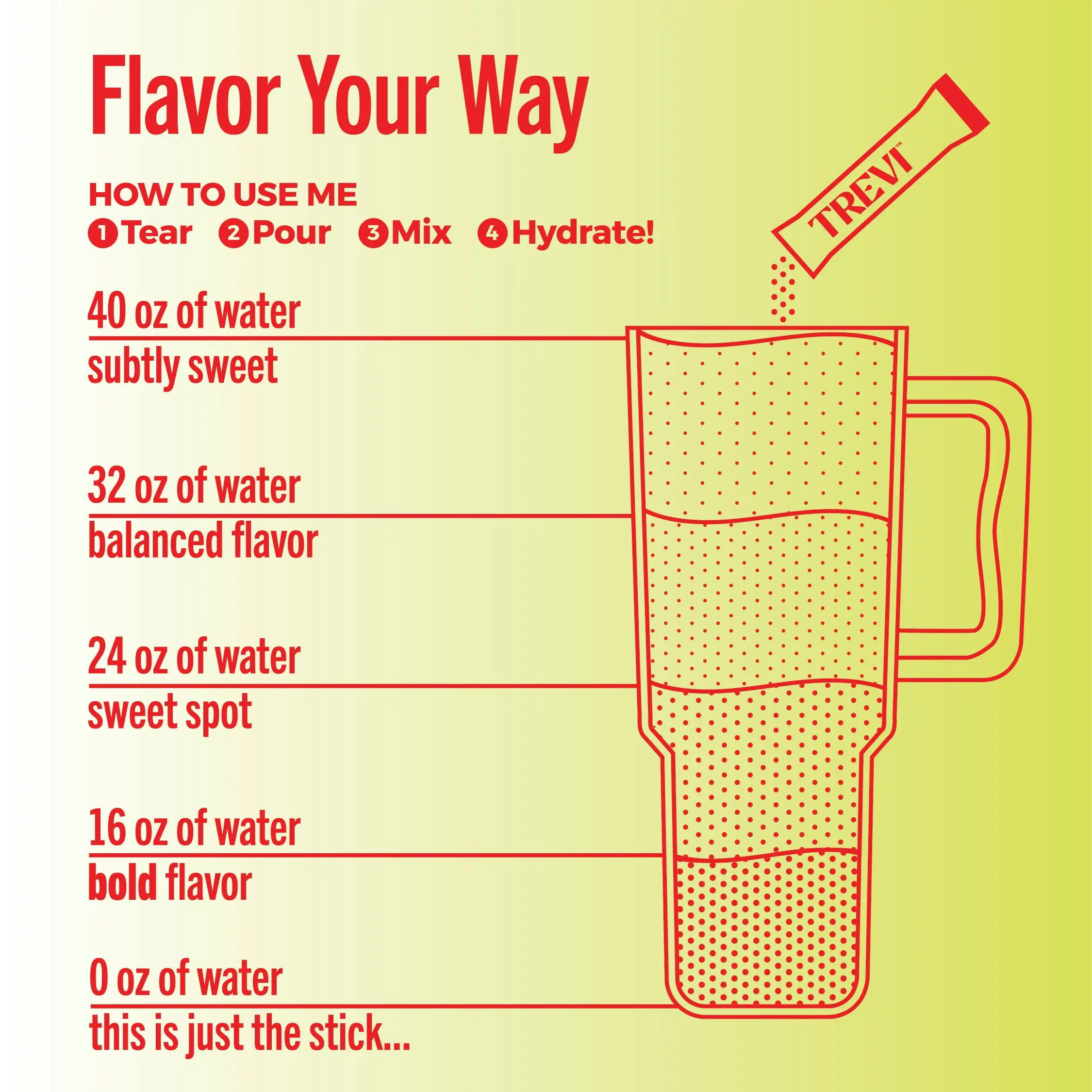 • Flavor versatility: 1 serving in 16oz for a strong flavor, or up to 40oz in your favorite tumbler for a subtle flavor.