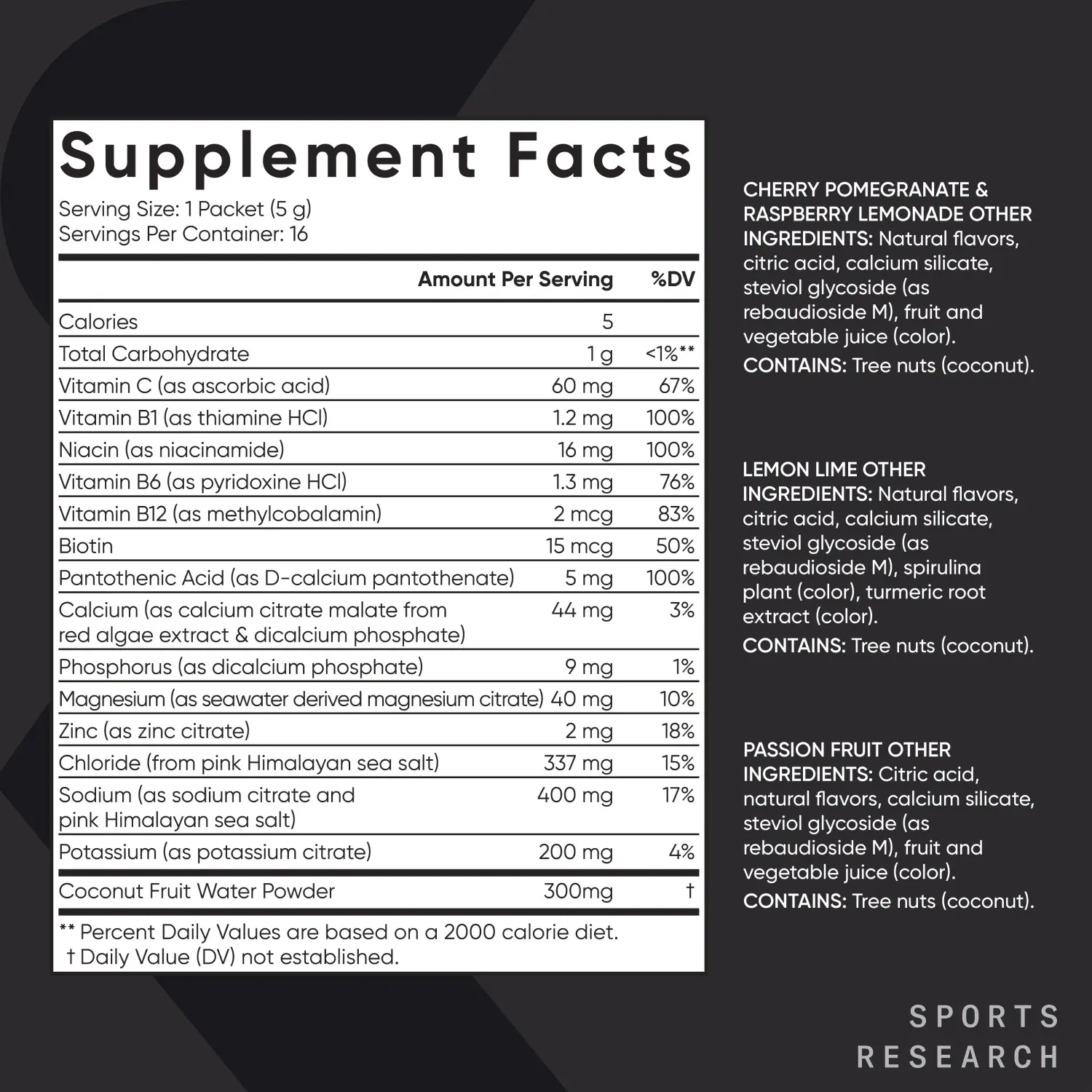 Each packet contains seven electrolytes: sodium, potassium, magnesium, calcium, chloride, zinc, and phosphorus. It also has 65+ trace minerals, seven essential vitamins, and coconut water. The formula provides 400 mg of Sodium and 200 mg of Potassium, the ideal ratio for hydration.