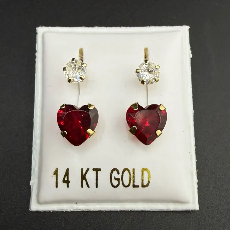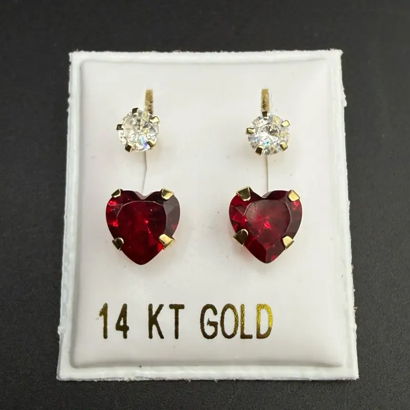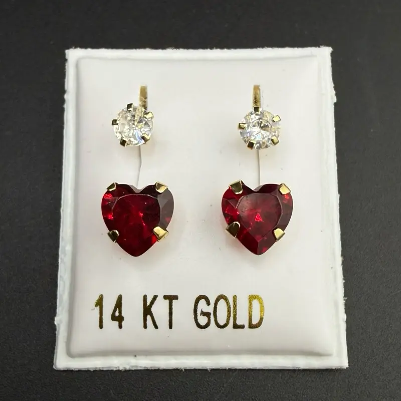 ·These 14k gold red heart earrings are a stunning accessory. The red hearts are beautifully complemented by a sparkling diamond at the top. Perfect for any occasion, these earrings add a touch of elegance to your outfit.