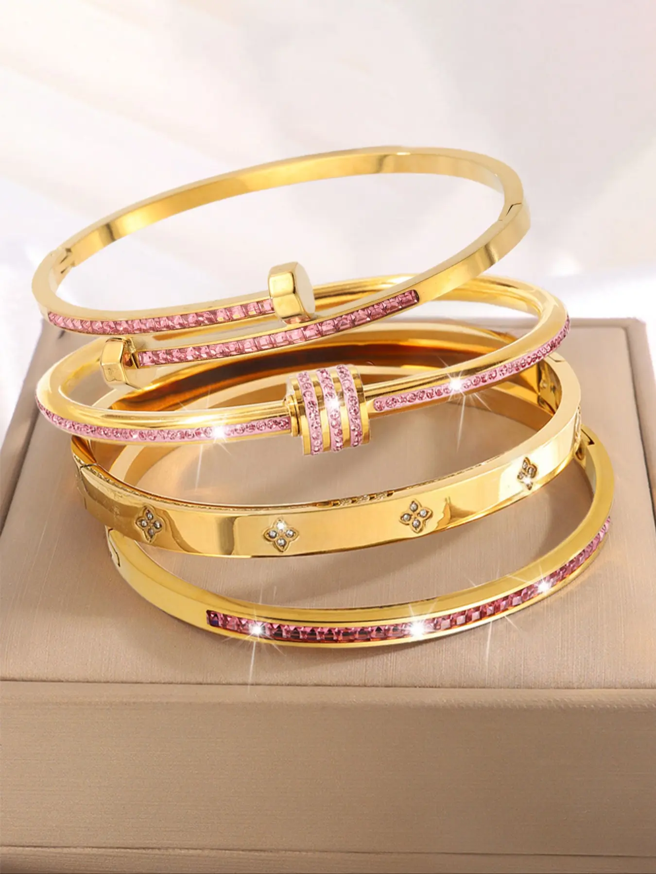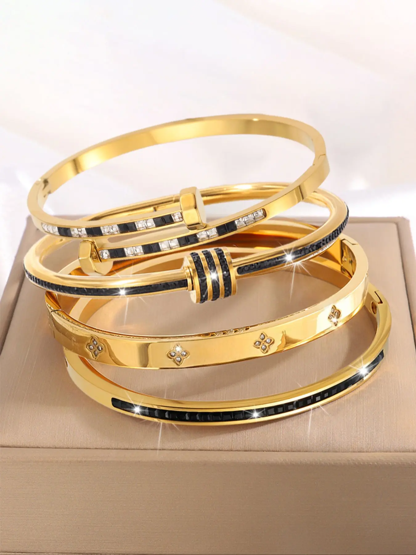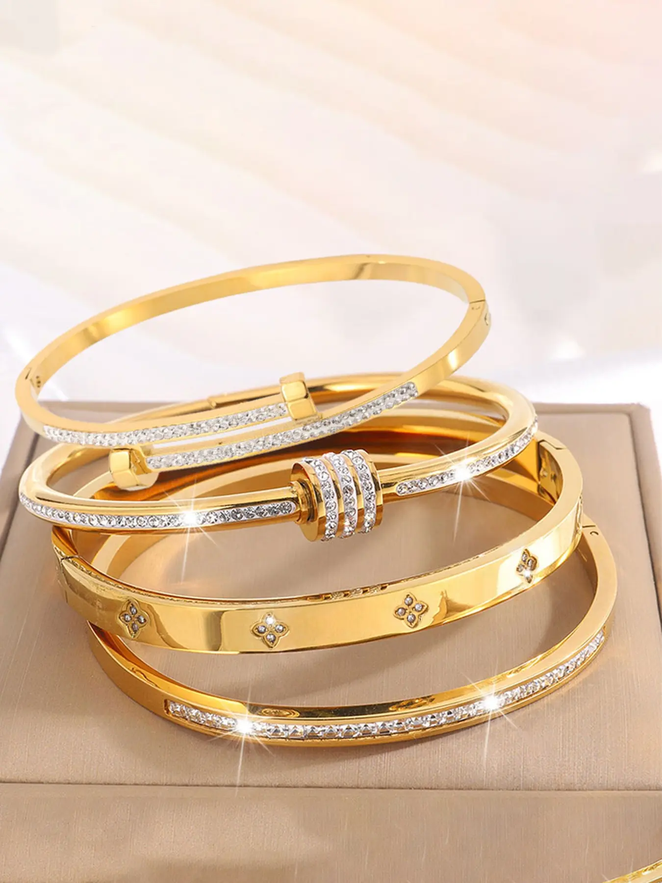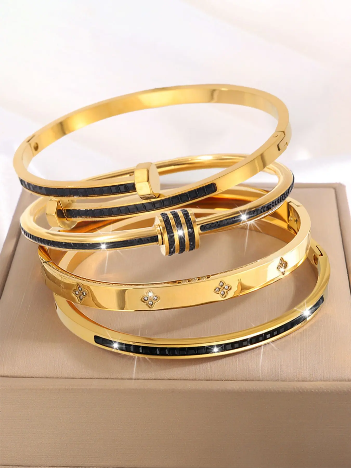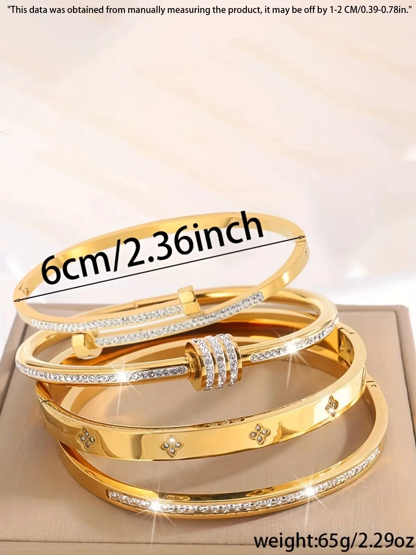 4-Piece Luxury Stainless Steel High Quality Bracelet Set, Women's Gold-plated Rhinestone Decorative Stackable Bracelets, Classic Wrist Accessory, Perfect Exquisite Holiday Gift