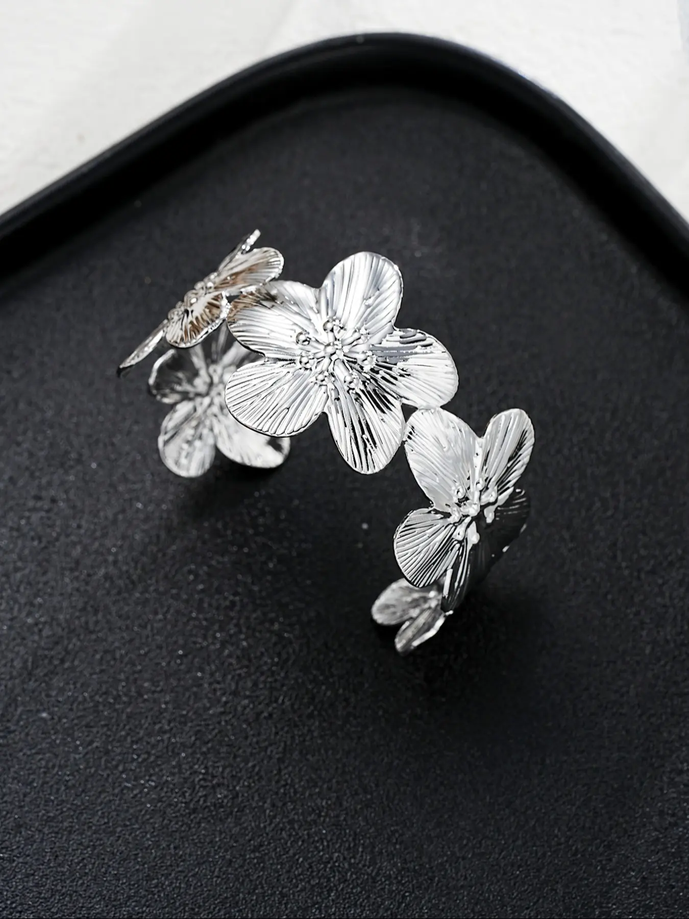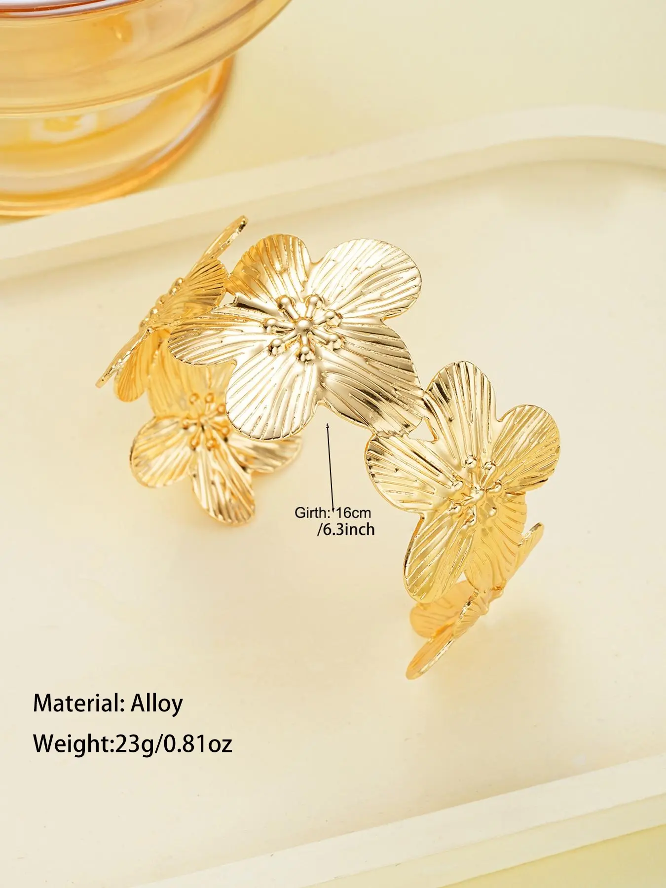 cheap, the gold looks silver. at least it’s adjustable. the flower bangle is short
