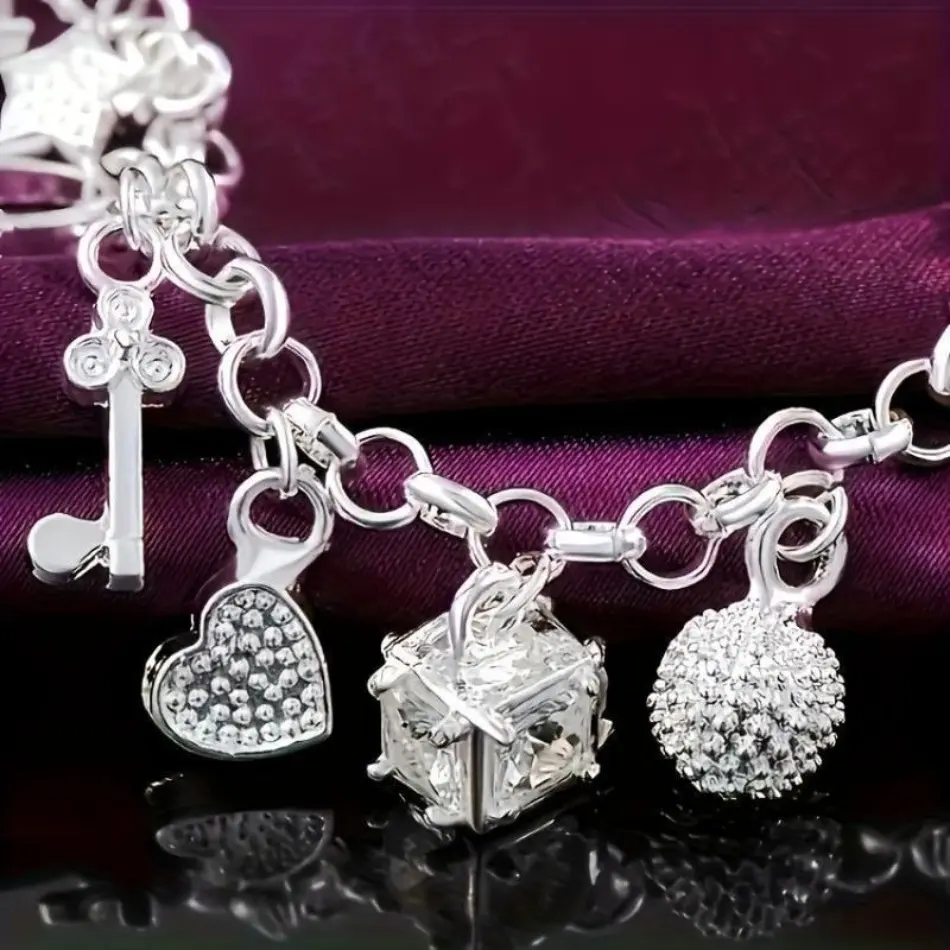 Elegant 925 Sterling Silver Heart Key Pendant Bracelet Material & Design: This bracelet is crafted from 925 sterling silver, featuring a stunning heart key pendant. It includes 13 small pendants, adding a bohemian charm. The shiny and exquisite silvery finish makes it perfect for women who appreciate elegant accessories. Versatility & Style: Ideal for various settings, this bracelet complements any outfit effortlessly. Its bohemian style makes it suitable for both special events and casual looks. It's a must-have for women who love fashion jewelry. Perfect Gift: This bracelet is a thoughtful gift for your wife, girlfriend, or as a birthday present. The combination of 925 sterling silver and bohemian design ensures it stands out as a unique fashion gift. Surprise your loved ones with this exquisite piece today!