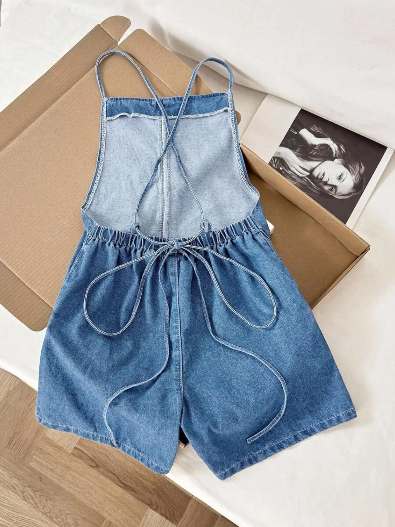 Elegant Backless Denim Jumpsuit for Women, Tie-Waist Slimming Wide Leg Shorts, Summer Fashion One-Piece