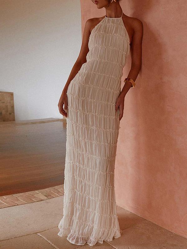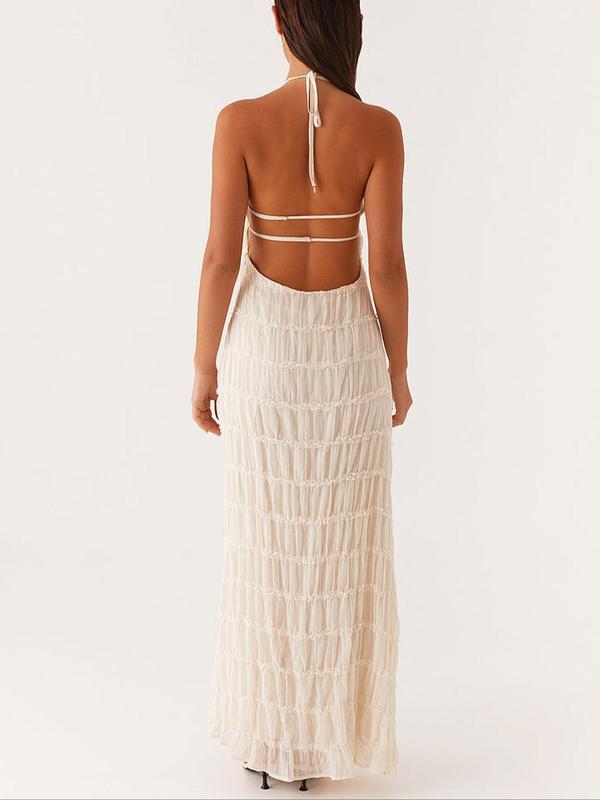 Women's Elegant Backless Halter Maxi Dress, Stylish Beach Vacation Dress for Summer, Romantic Casual Evening Wear #maxidress #partydresses #swimsuitcoverup #plussizeweddingdress #holidaydresses #halterjumpsuit #plussizebeachwear #bestdress #beadedpromdress #weddingguesstdress