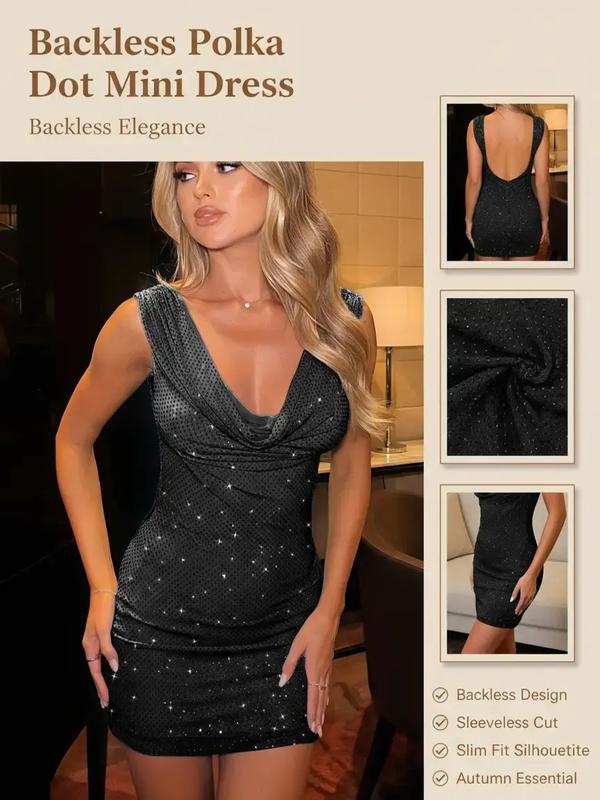 5. Fashion Elegant Sexy Backless Sleeveless Slim Fit Short Dress, Polka Dot Pattern, Fall Season, Women's Casual Wear