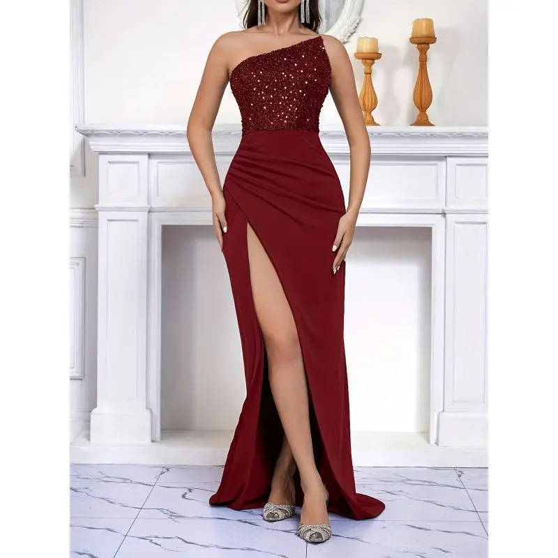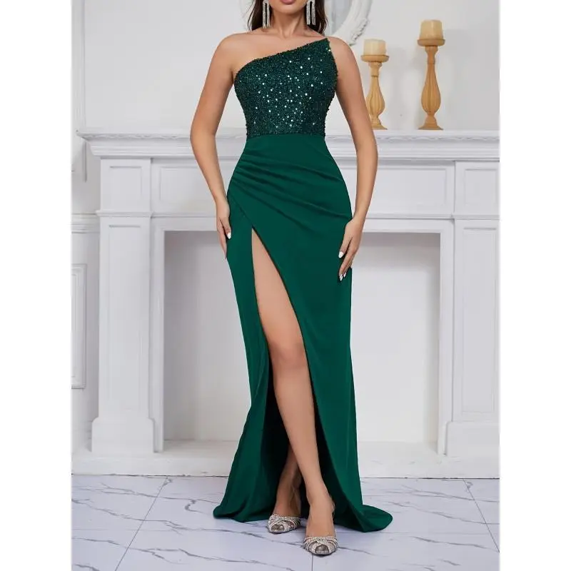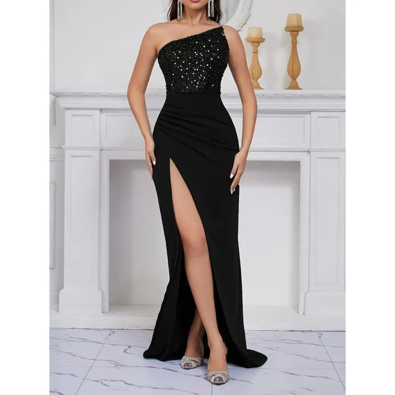 [Sequin Bandeau Gown] Asymmetrical Elegant Black Sequin Bandeau Gown |   100% Polyester Knit Fabric, 186gsm Weight, Lined with 110gsm Polyester |   Adult Solid Color Evening Dress, Bodycon Wedding Party Cocktail Dress