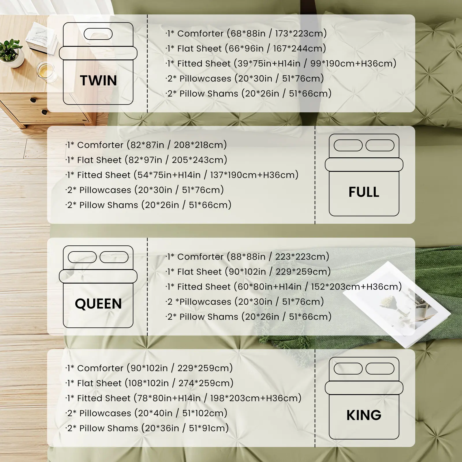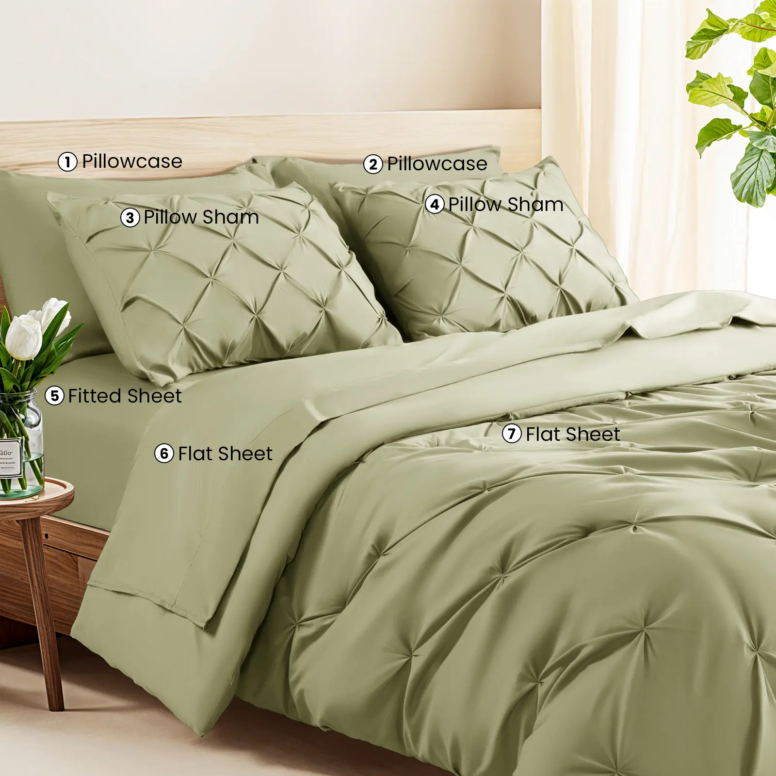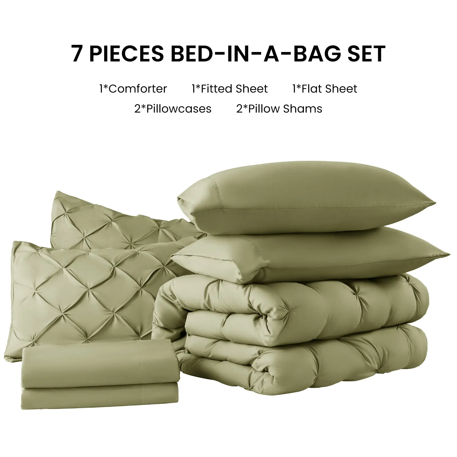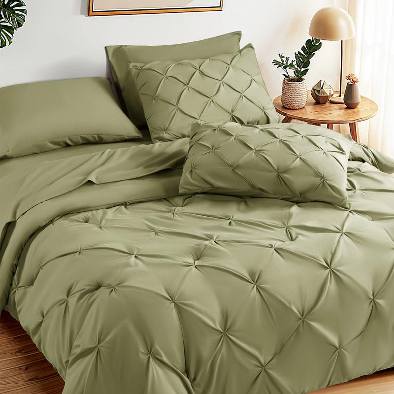 ️ Includes: Comforter (1), Fitted Sheet (1), Flat Sheet (1), Pillowcases (2), Decorative Shams (2)