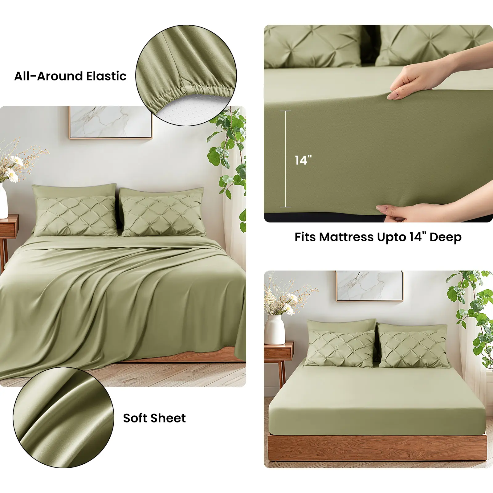 The sheets are designed with high-quality elastic, ensuring a perfect fit on mattresses up to 14 inches deep. This elasticized feature provides a snug, secure fit that prevents any slipping or shifting, keeping your bed looking tidy and comfortable all night long. Whether you're tossing and turning or simply adjusting the sheets, rest assured they will stay in place, offering a smooth and seamless sleep experience every time.02