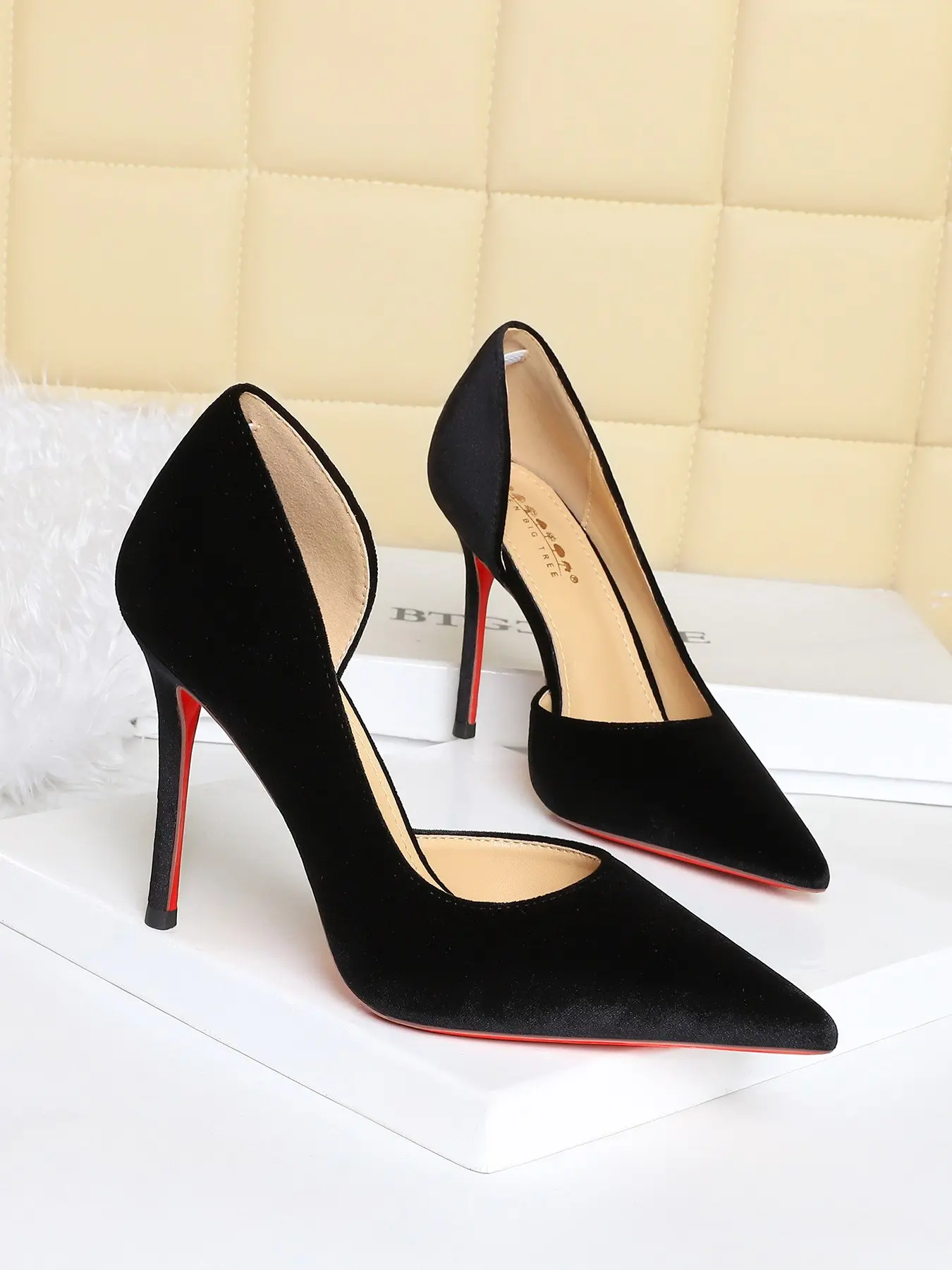Elegant European Style Party Shoes, Sexy Slimming Pointed Toe High Heels Stiletto Heeled Pumps, Velvet Side Cutout Low-Cut Single Shoe for WomenElegant European Style Party Shoes, Sexy Slimming Pointed Toe High Heels Stiletto Heeled Pumps, Velvet Side Cutout Low-Cut Single Shoe for Women