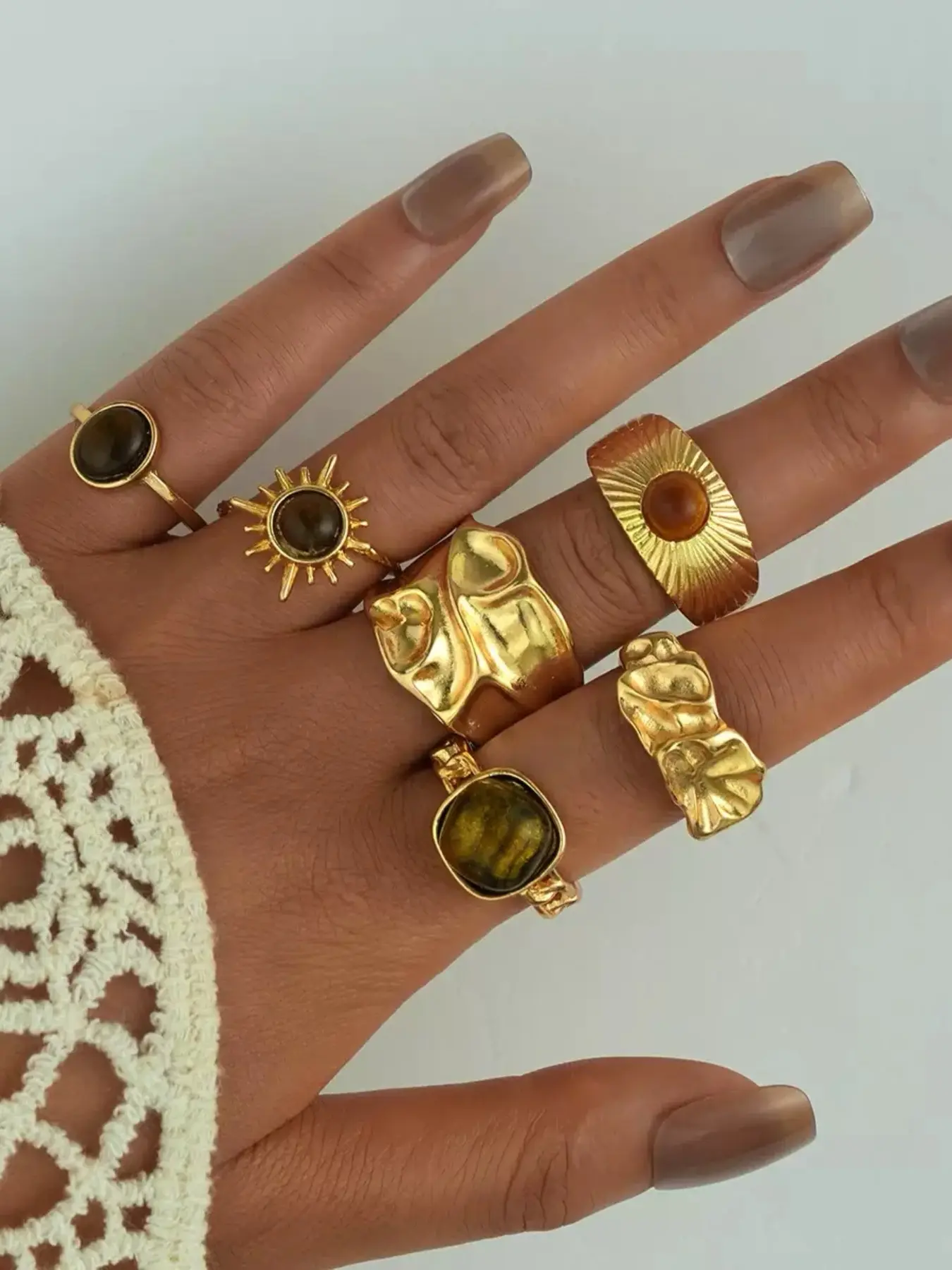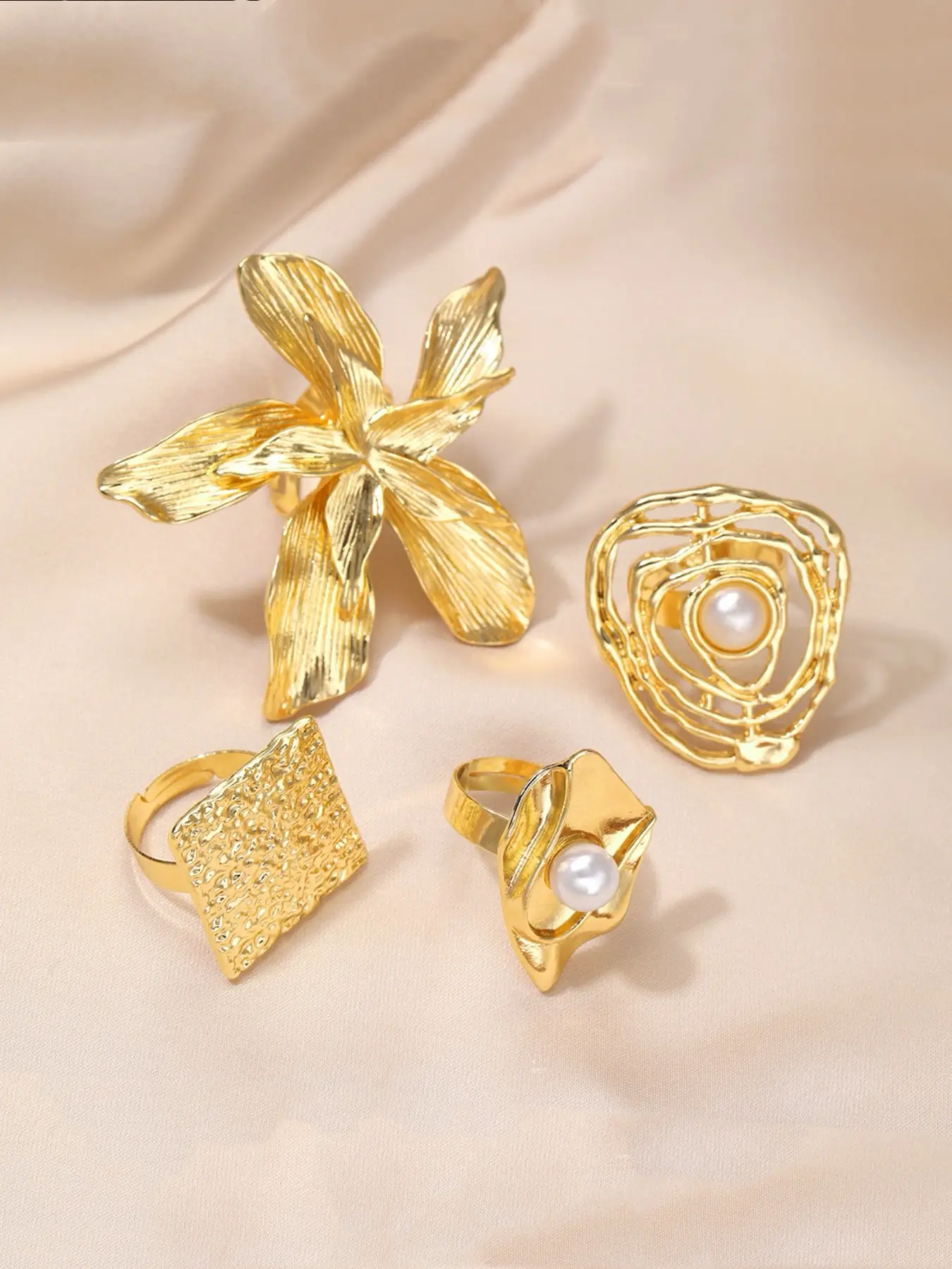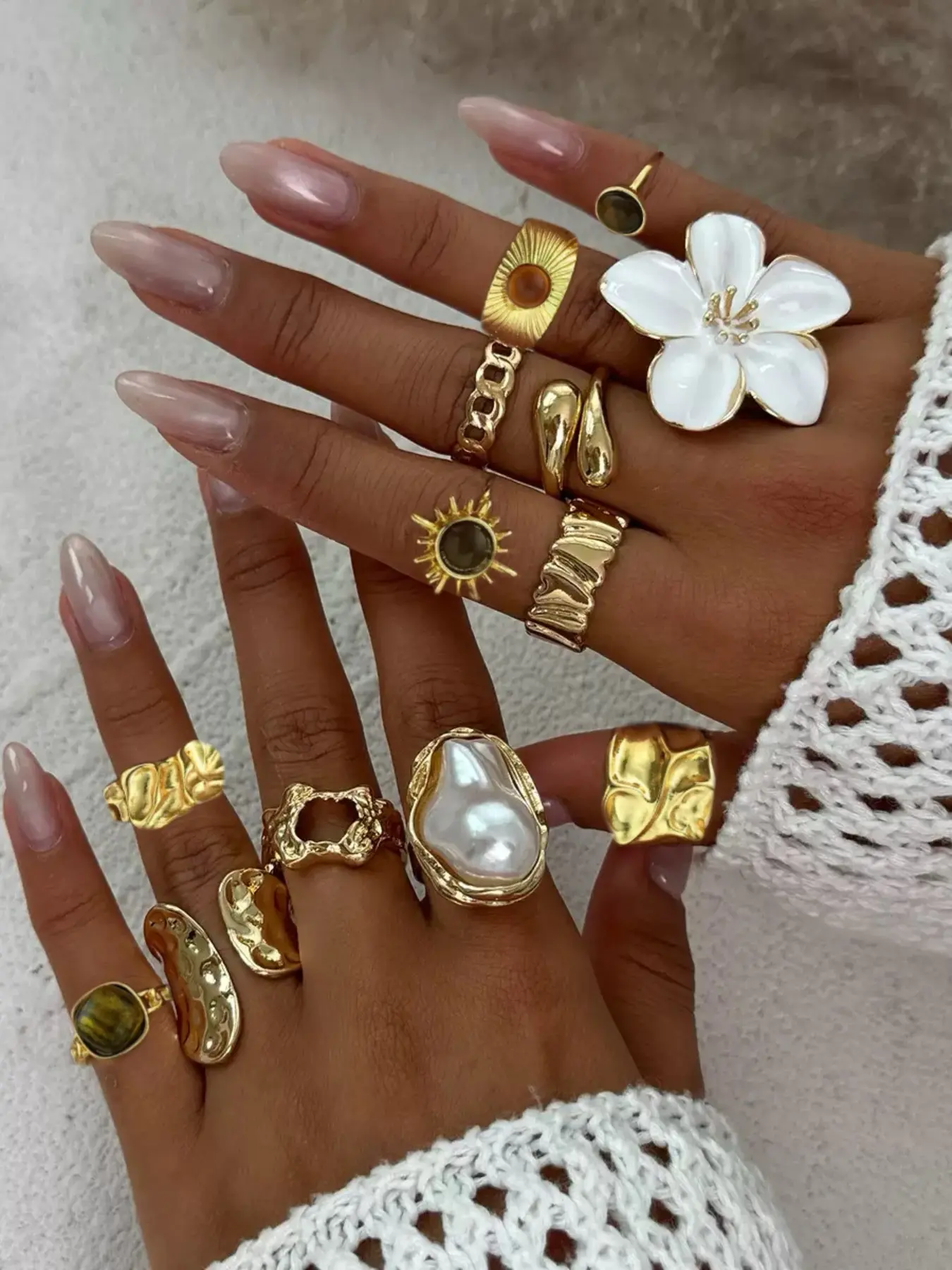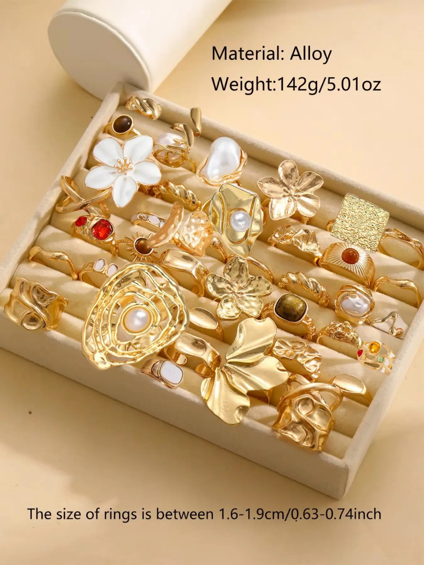 There were no large pieces in this order. I order the set of 38. Expecting to get the rings I see in the picture. The white flower ring is as small as the gold one and the larger half ring was not in the bag at all. Over all nice rings, I was looking forward to receiving the larger more exaggerated