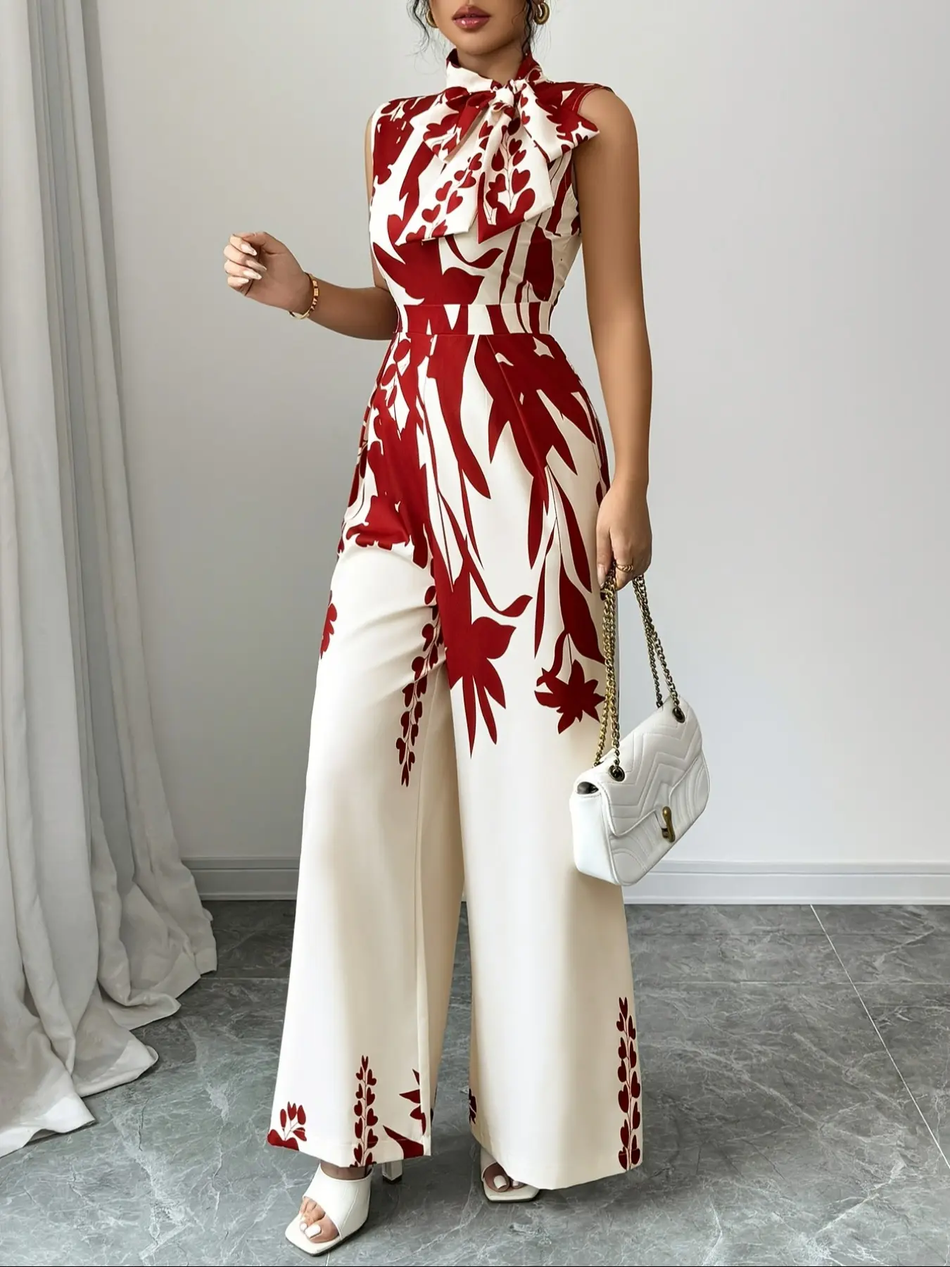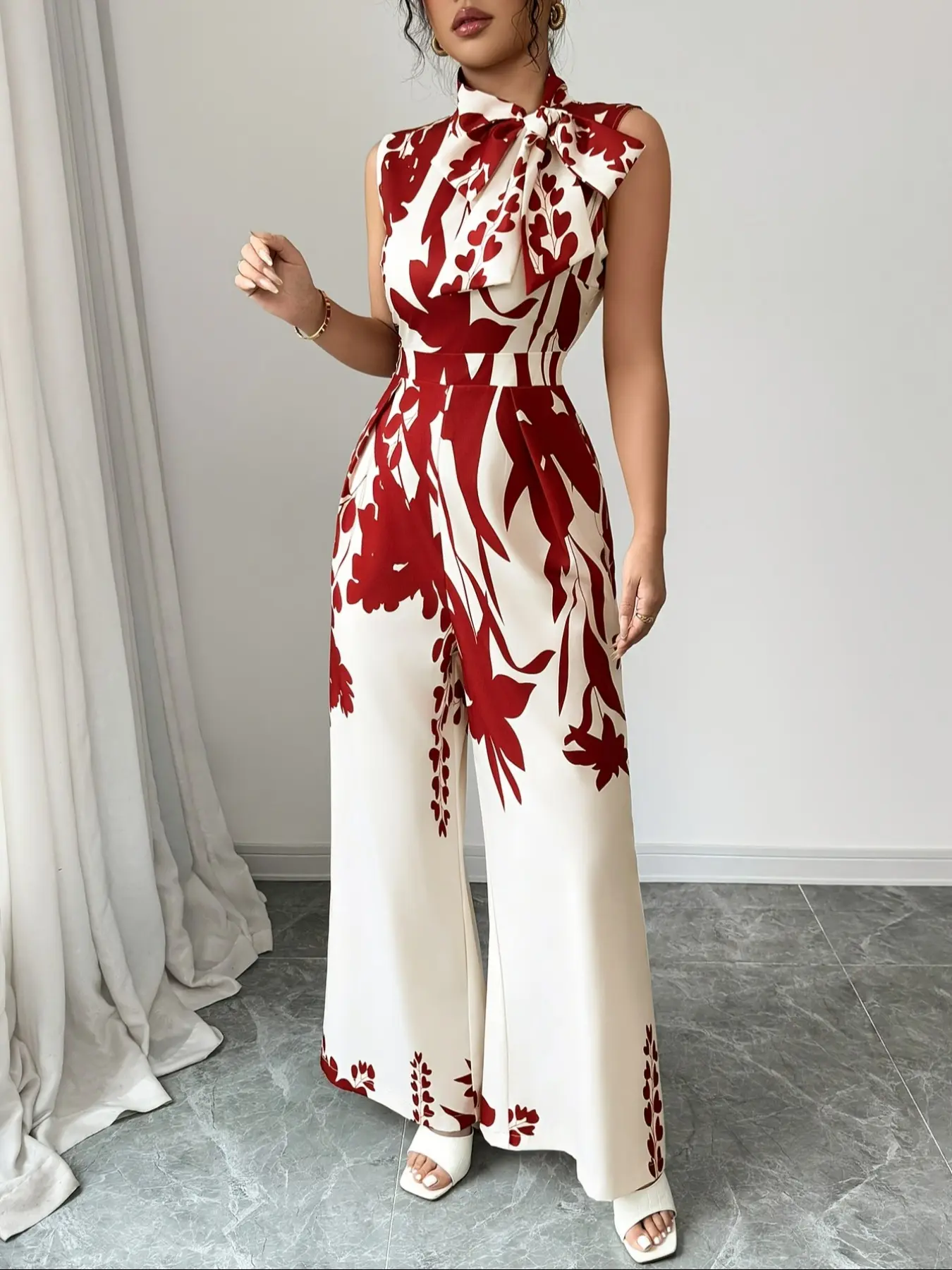 Elegant Women's Floral Print Jumpsuit, Bow Detail, High Neck Sleeveless Wide Leg, Fashion Design, All Seasons Wear, Casual Fashion Jumpsuit