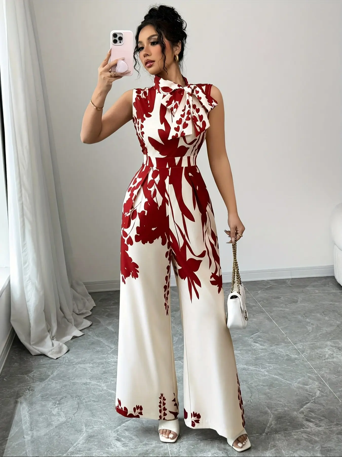Elegant Women's Floral Print Jumpsuit, Bow Detail, High Neck Sleeveless Wide Leg, Fashion Design, All Seasons Wear, Casual Fashion Jumpsuit #TikTokShopBlackFriday #TikTokShopCyberMonday #spotlightfinds #ootd/  #clothing
