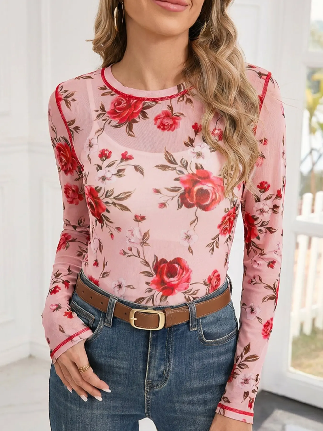 5. Elegant Floral Print Mesh Round Neck Slim Fit Long Sleeve Top, Hotapei Women's Fashion Blouse Shirts, Casual Wear for Spring and Fall