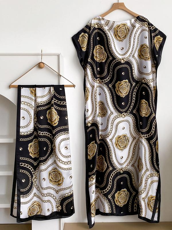 Elegant Floral Print Robe Set with Shawl Collar Dress, Long Scarf Headband for Women, Beach Sun Protection Satin Silk Fabric
