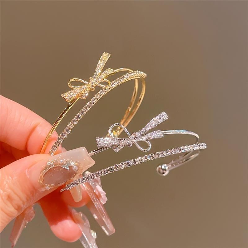 Elegant Gold Bow Bracelet Shiny Synthetic Cubic Zirconia: This bracelet is inlaid with sparkling synthetic cubic zirconia, adding a touch of elegance to any outfit. Versatile Open Design: The open design makes this bracelet versatile, suitable for both casual wear and special occasions. It's a perfect accessory for any occasion. Vintage Style: With its vintage style, this bracelet adds a touch of sophistication to your look. It's an exquisite design that complements any outfit. Women's Bracelet: This bracelet is specifically designed for women, making it a versatile addition to any jewelry collection. Exquisite Design: The intricate bow design makes this bracelet a standout piece. It's a beautiful accessory that will complement your style.