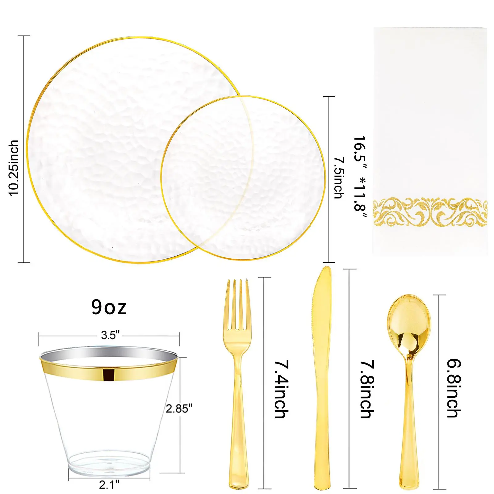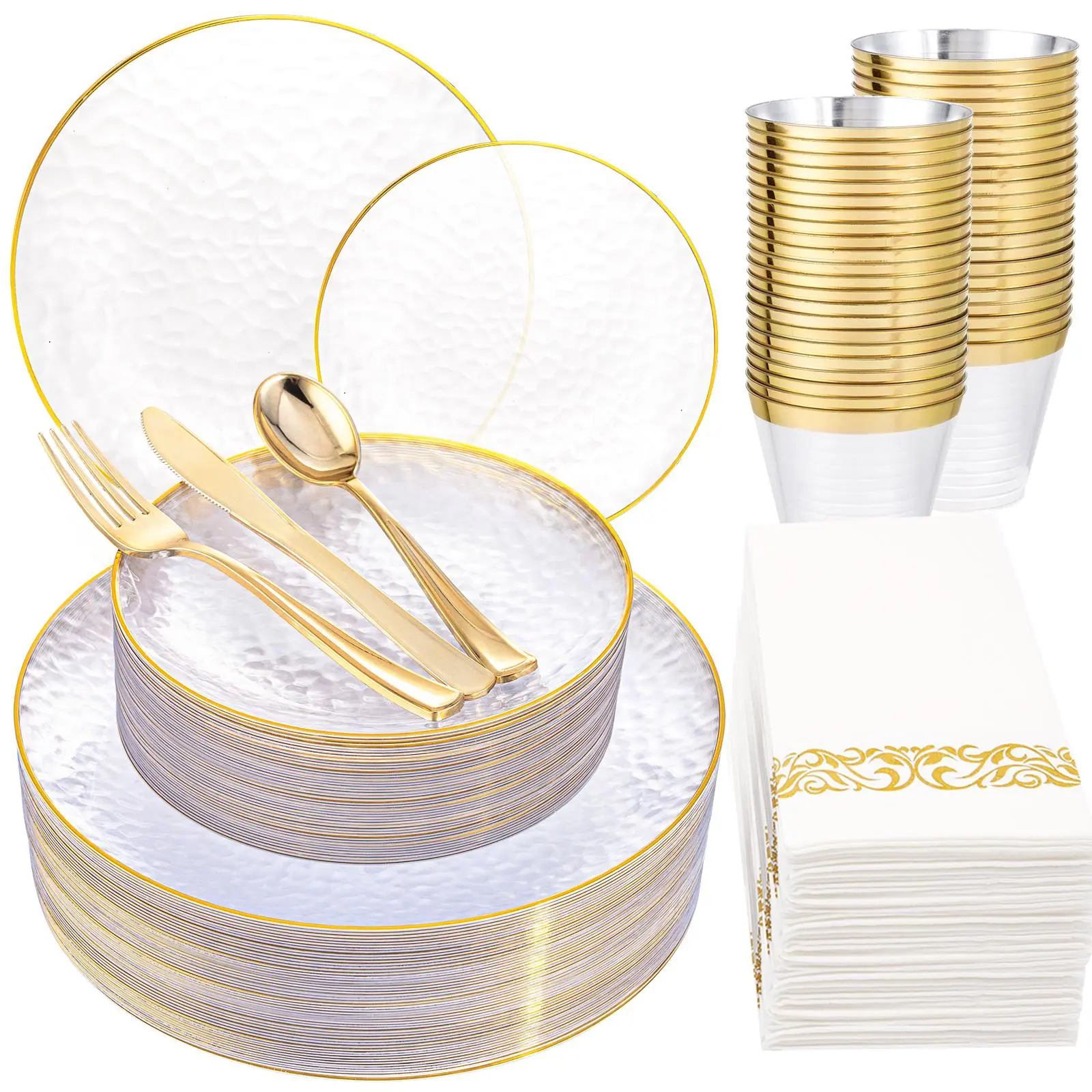 175PCS Clear Gold Plastic Dinnerware Set for 25 Guests, Hammered Disposable Plates for Party, Include: 25 Dinner Plates, 25 Dessert Plates, 25 Gold Silverware Set, 25 Napkins, 25 Cups