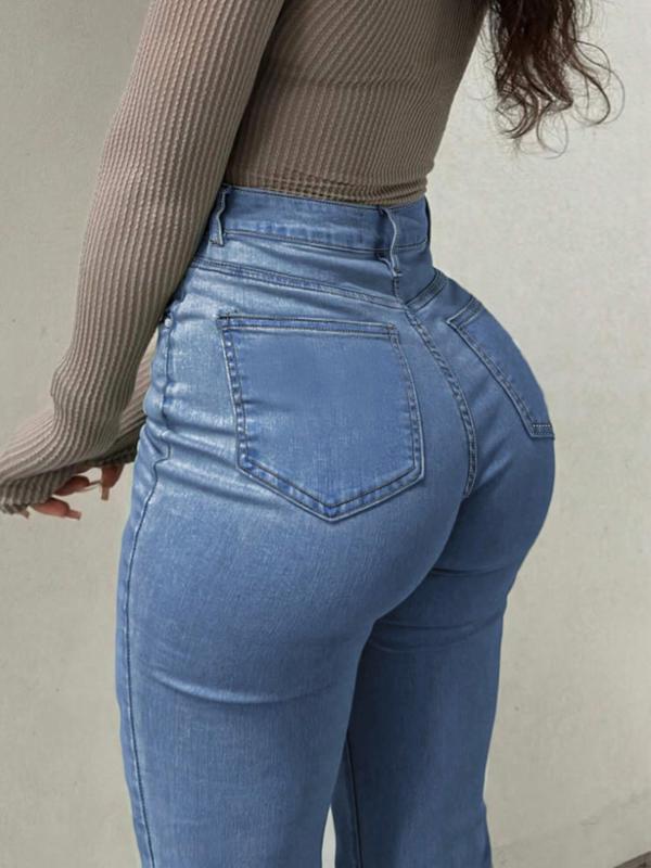 Elegant High-Waisted Stretchy Slim Fit Tall Denim Flare Pants for Women, Stylish Solid Color Versatile Look for All Seasons