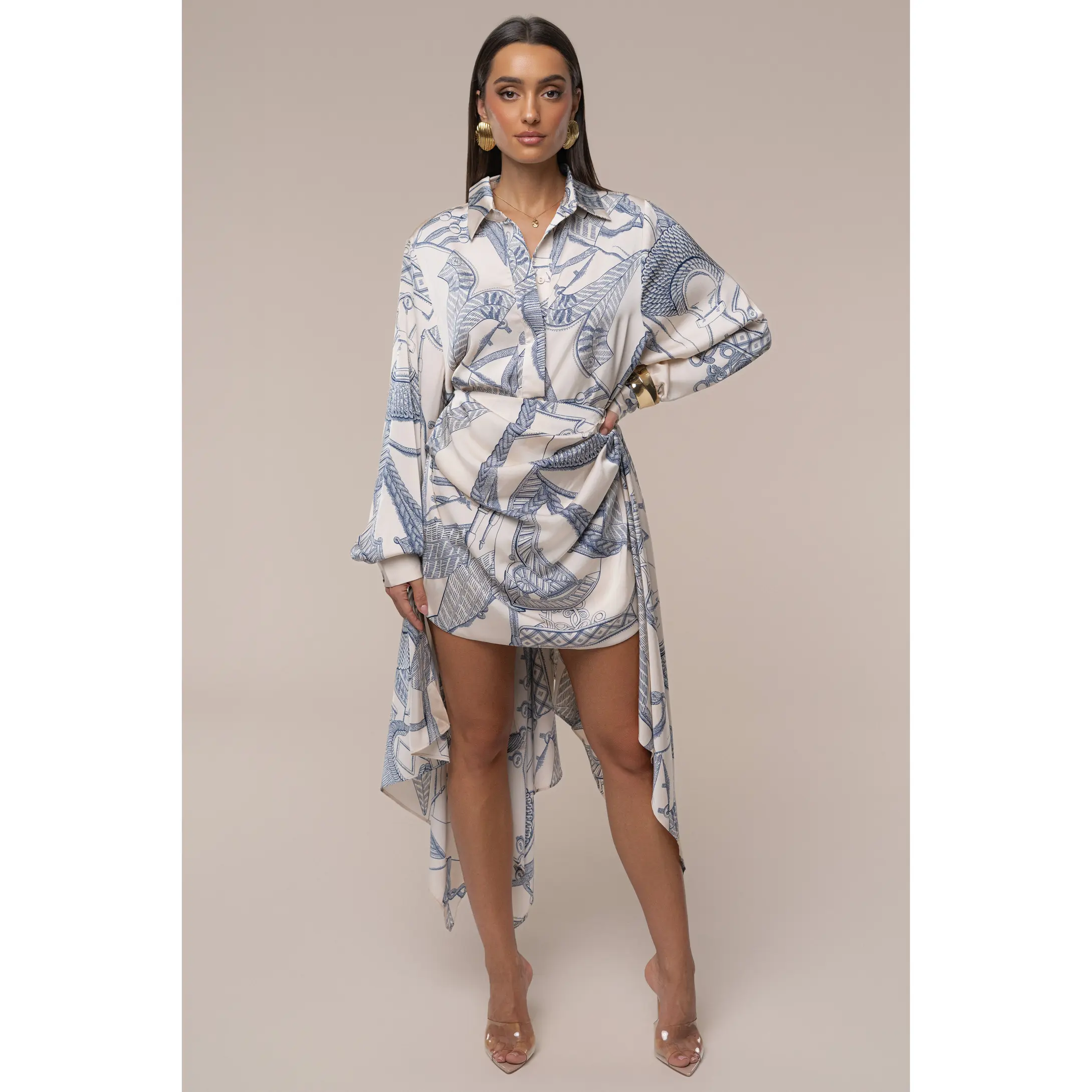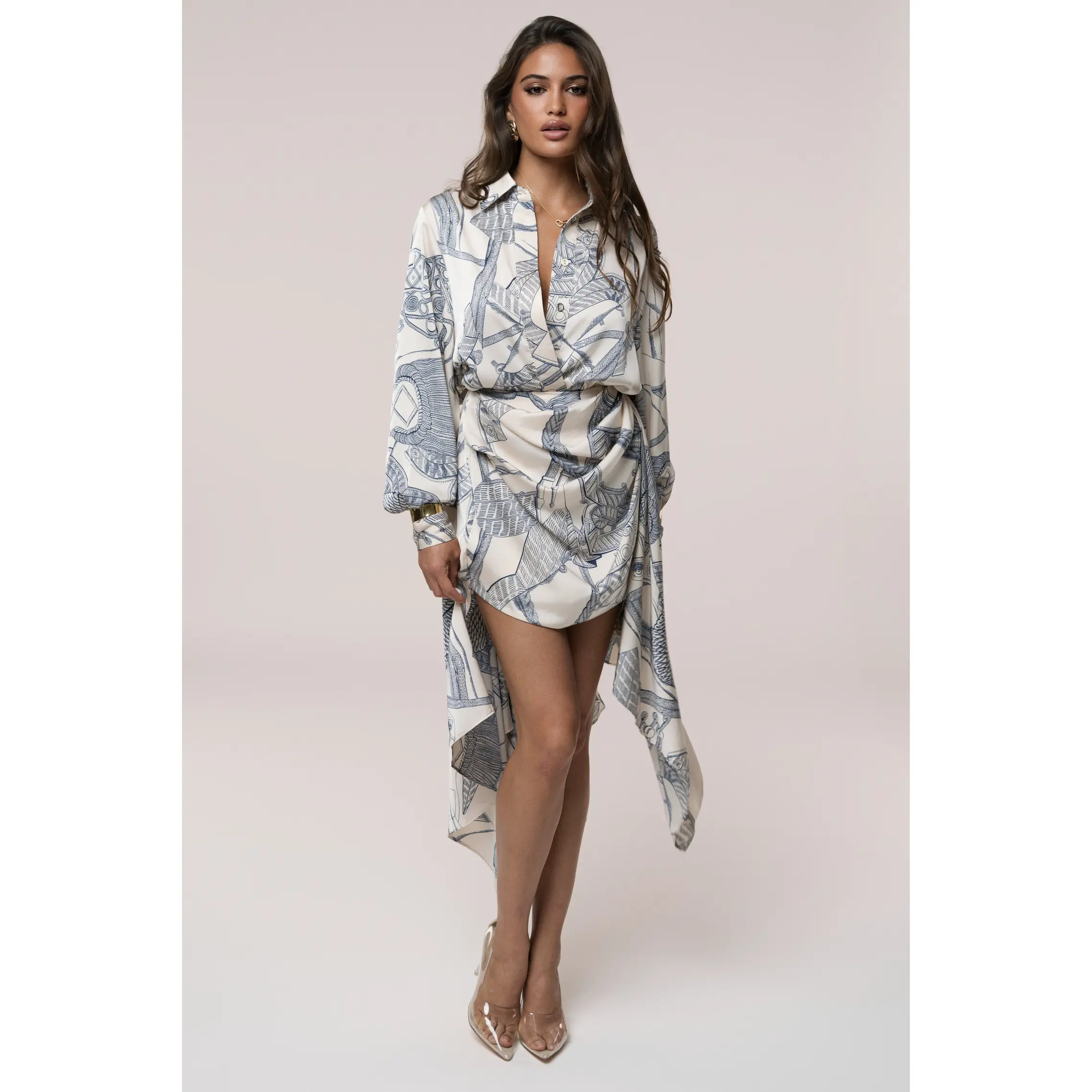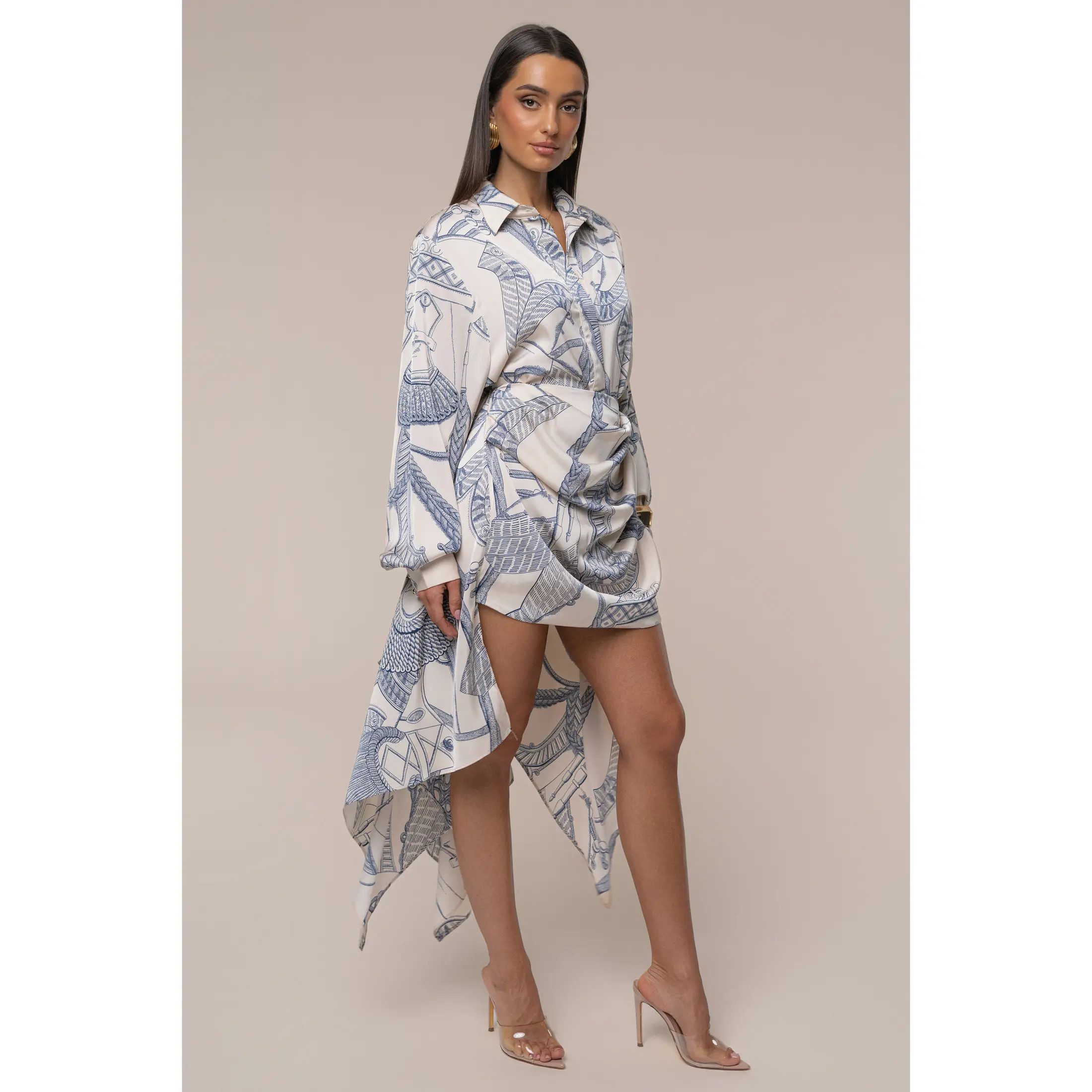 Step into understated elegance with the Ivory Print Ameena Skirt Set, a refined two-piece look that effortlessly blends style and sophistication. This coordinated set features a long-sleeved button-up top paired with a matching mini-length skirt, both adorned in a mesmerizing abstract print of cream and soft blue-grey tones. The skirt is slightly ruched, adding a touch of texture to its chic design, while graceful side and back drapes bring a flowing, playful touch to your silhouette. Perfect for daytime outings or chic evening plans, this skirt set exudes polished charm. No stretch. Single lined. Sold as a set.