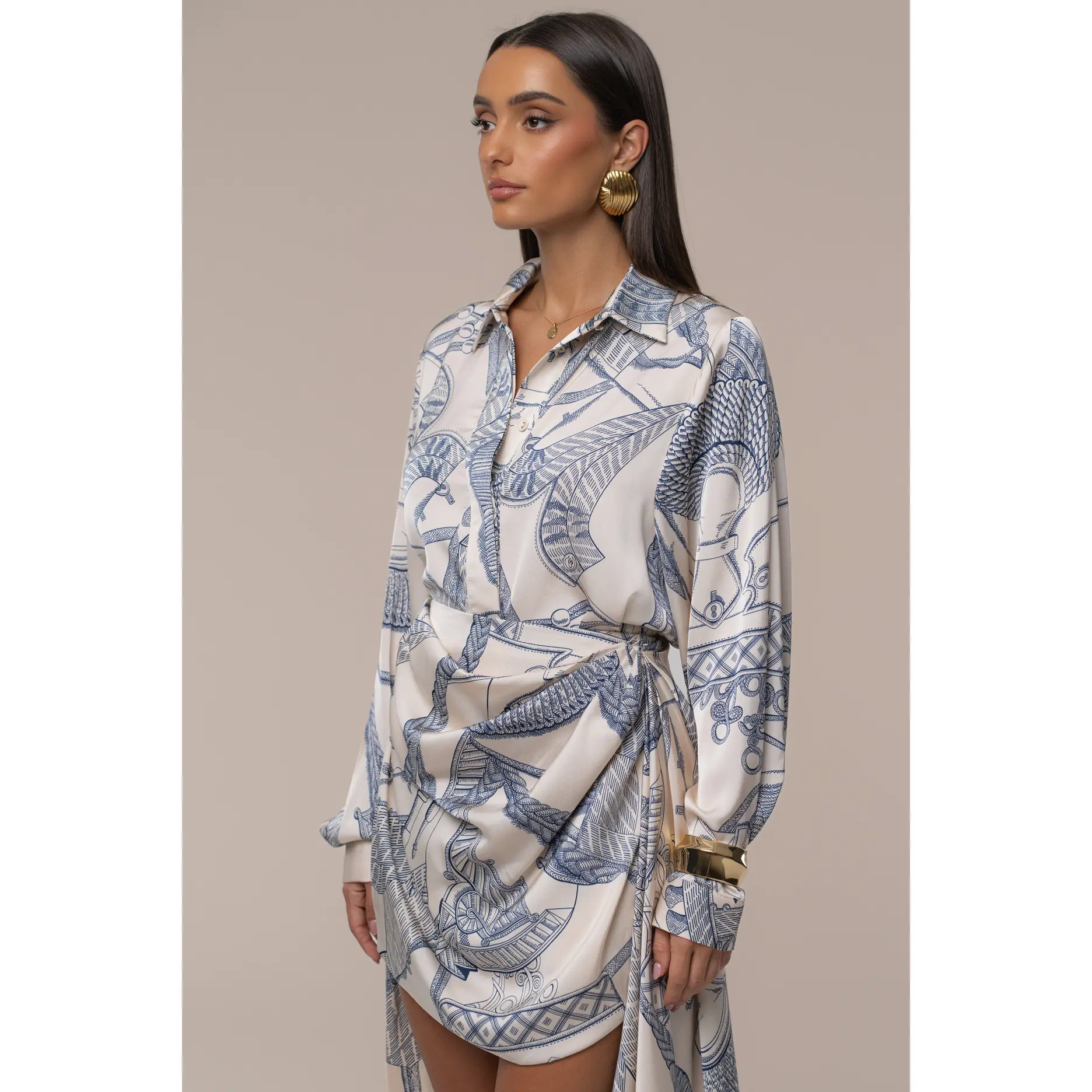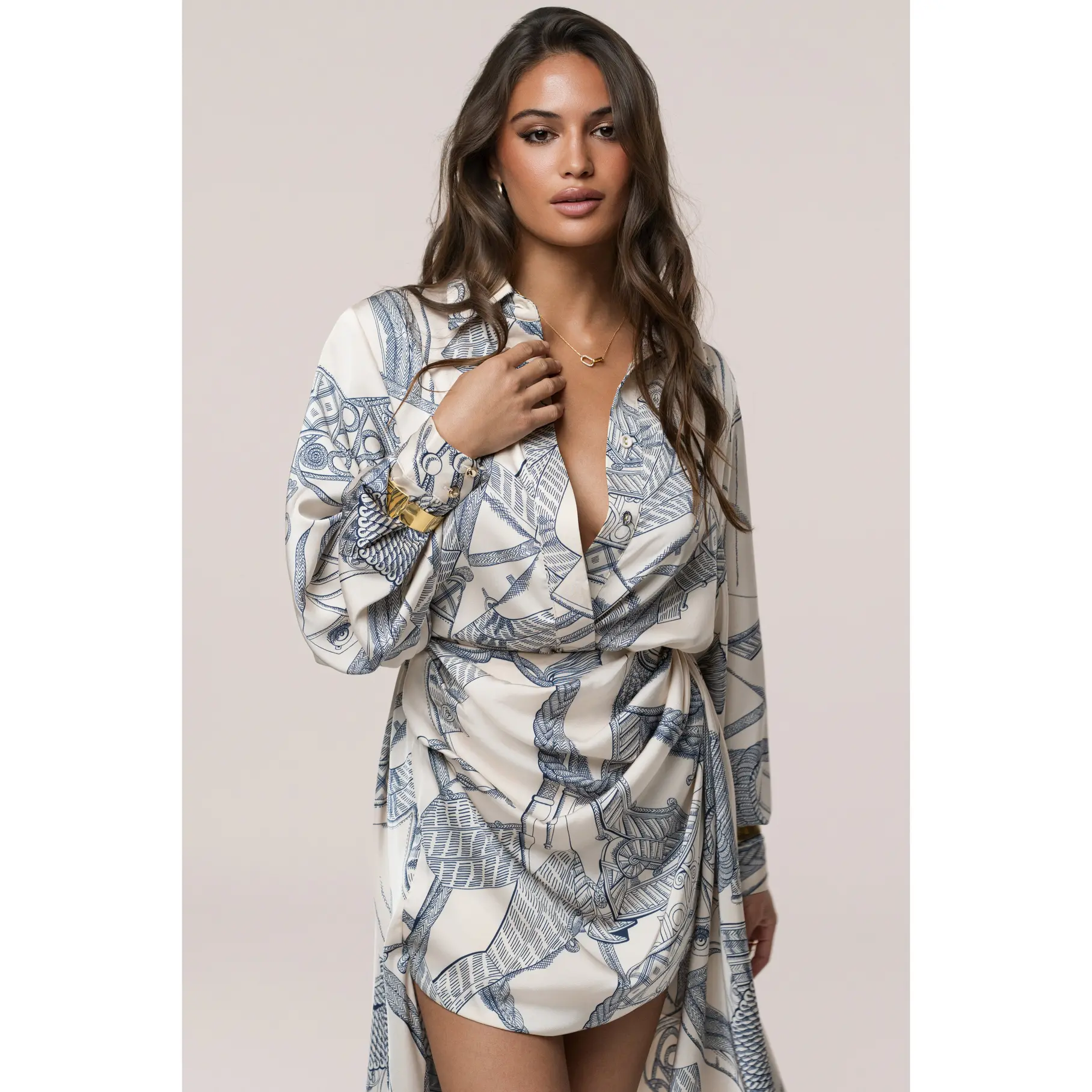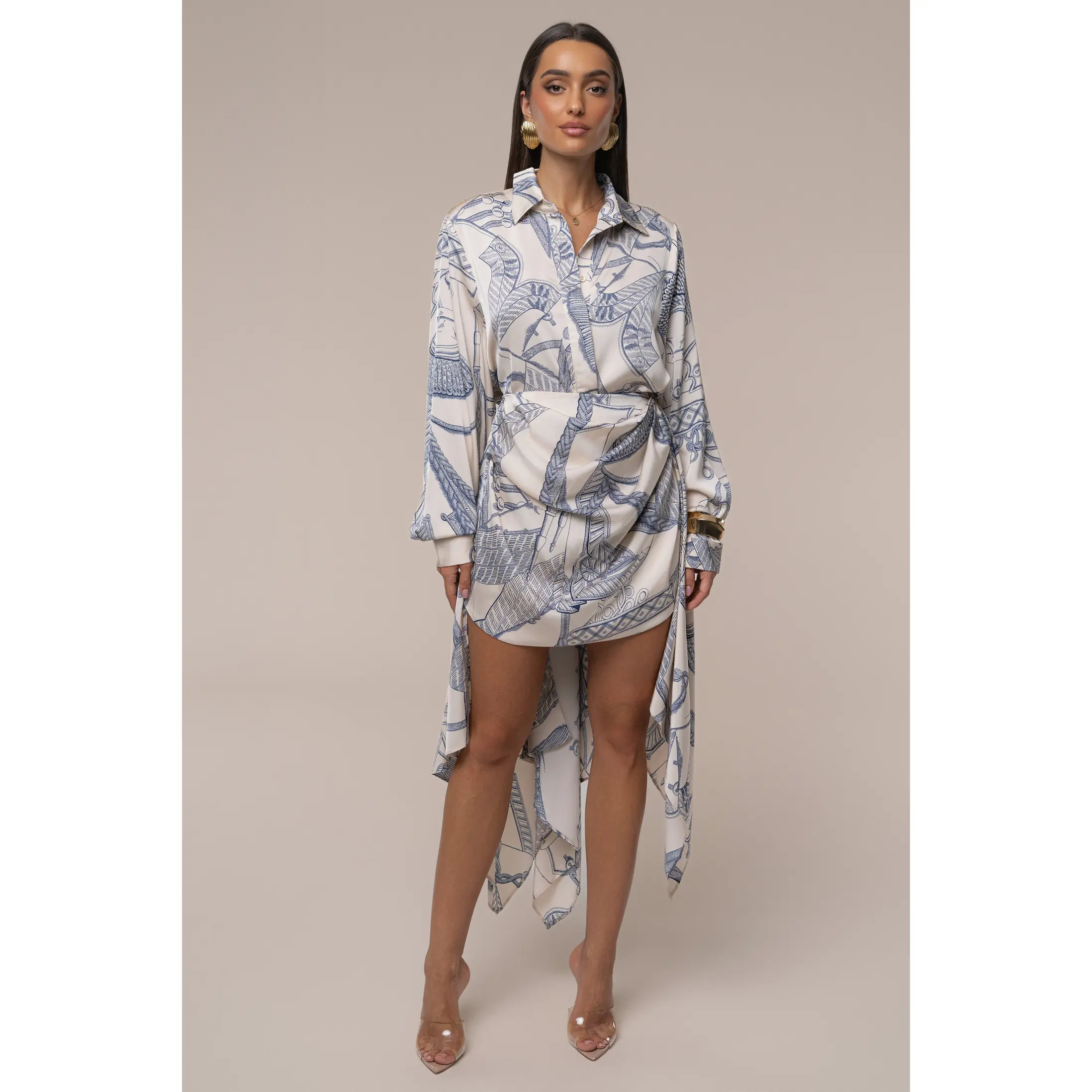Step into understated elegance with the Ivory Print Ameena Skirt Set, a refined two-piece look that effortlessly blends style and sophistication. This coordinated set features a long-sleeved button-up top paired with a matching mini-length skirt, both adorned in a mesmerizing abstract print of cream and soft blue-grey tones. The skirt is slightly ruched, adding a touch of texture to its chic design, while graceful side and back drapes bring a flowing, playful touch to your silhouette. Perfect for daytime outings or chic evening plans, this skirt set exudes polished charm. No stretch. Single lined. Sold as a set.