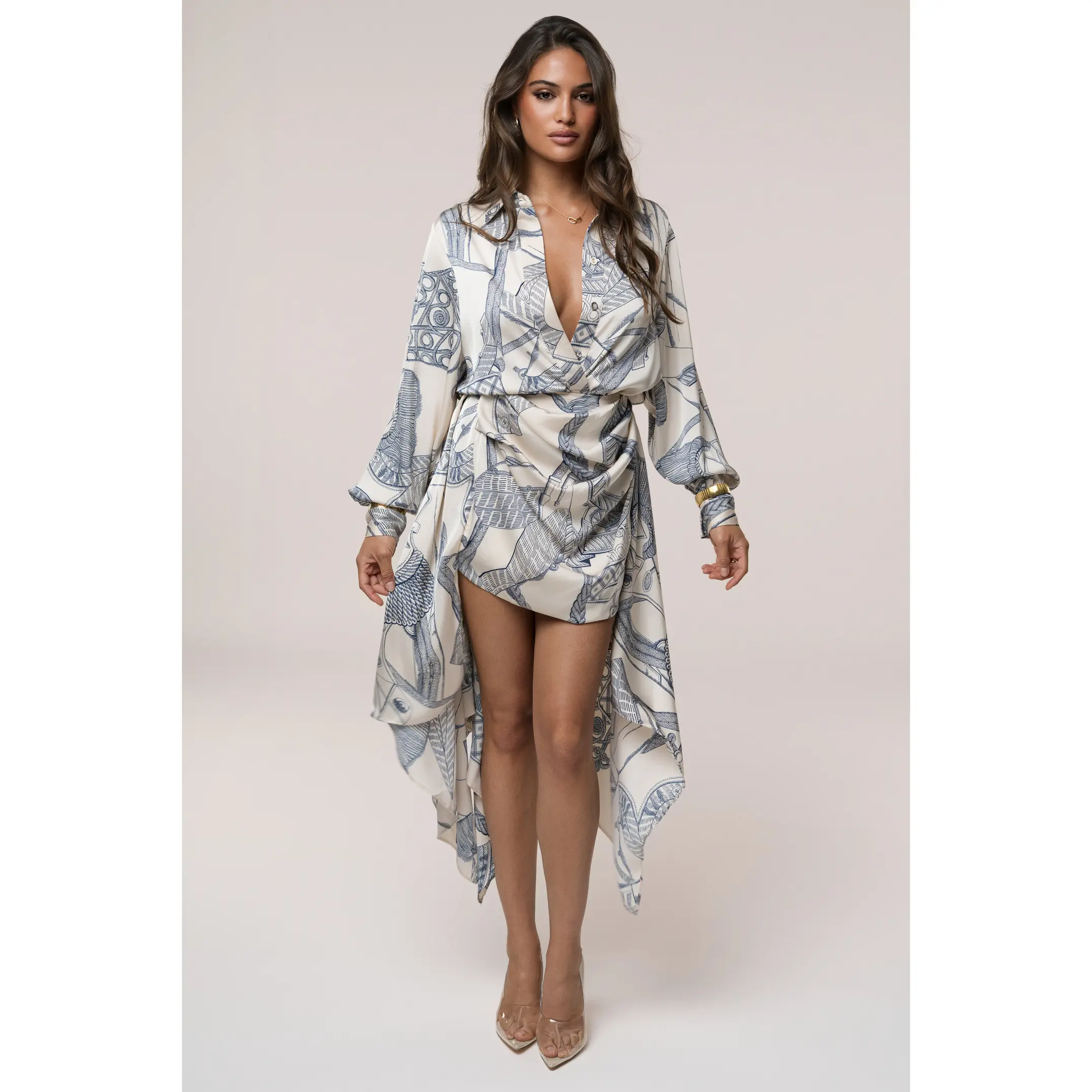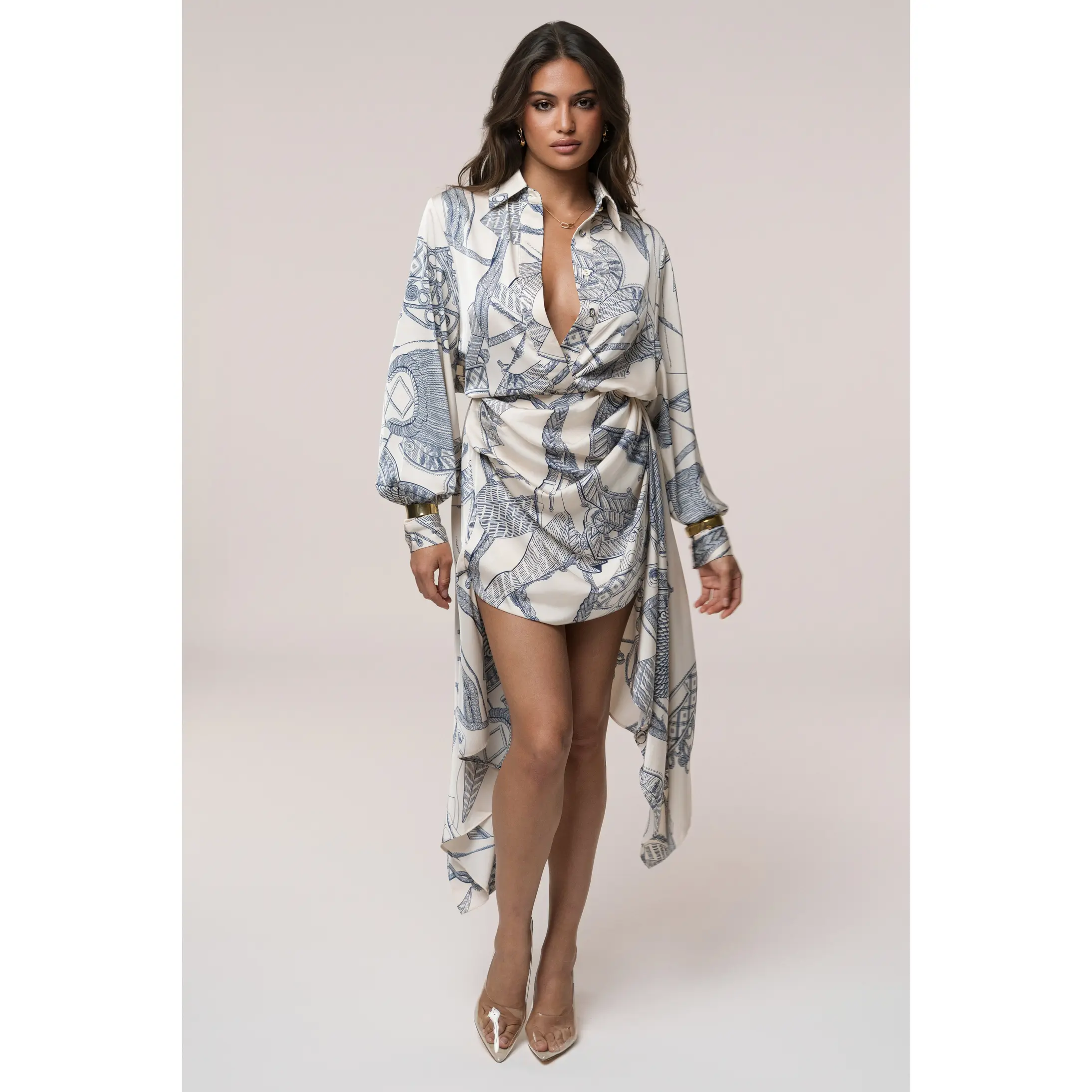 Golden hour + city views = the perfect moment for this dreamy wrap shirt dress 🤍💙 Soft silky fabric, chic sketch-print, deep V neckline, and a snatched tie-waist that flatters every angle. The flowy high-low hem gives that effortless “I didn’t try but I look expensive” vibe—perfect for park dates, brunch, or sunset strolls. #WrapDress #ShirtDress #CityGirlStyle #GoldenHourFit #EffortlessChic