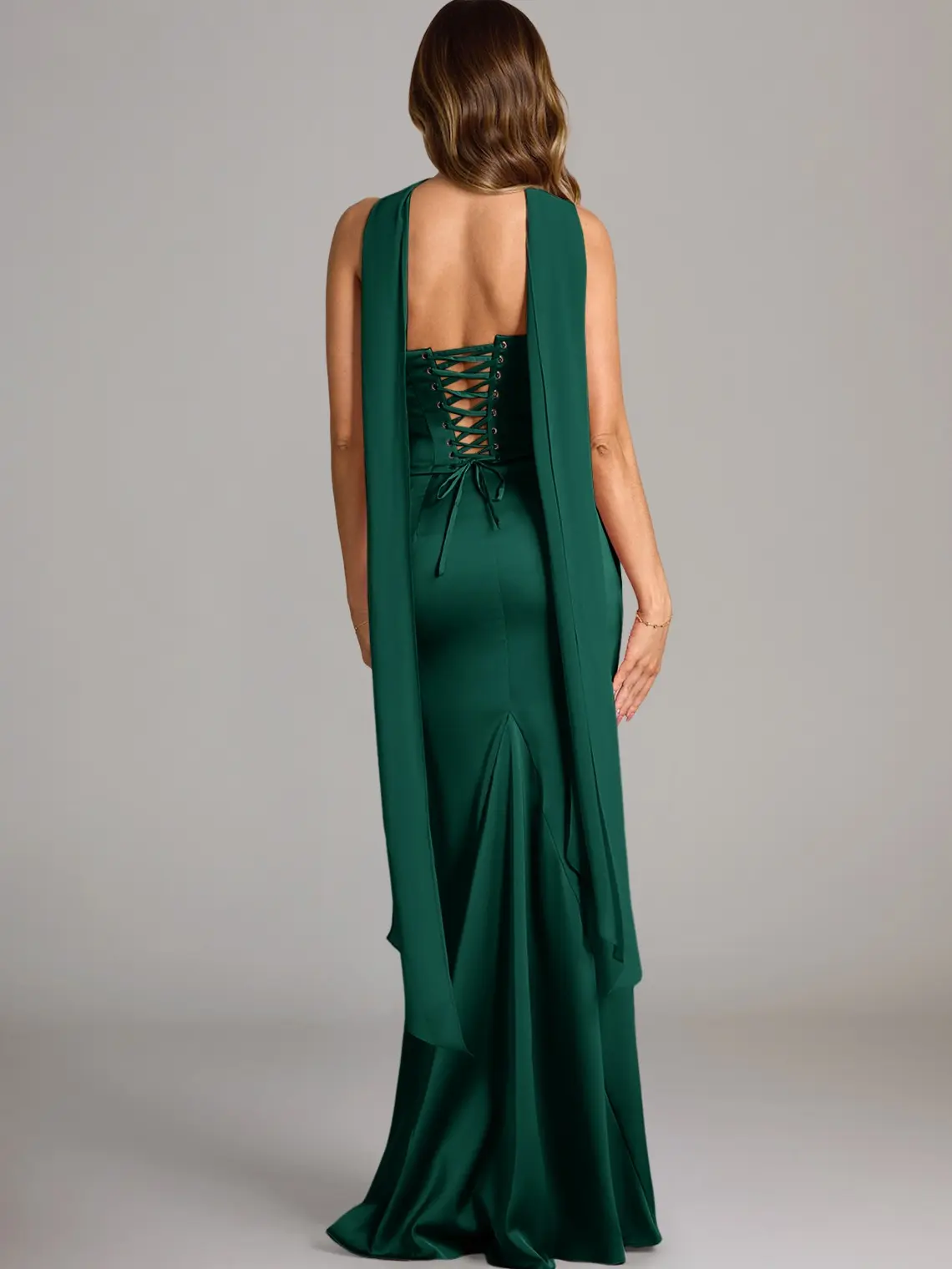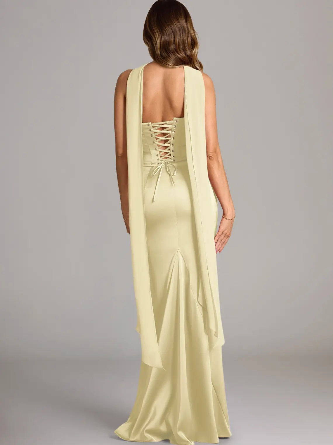 ✨ Elegant Two-Piece Gown ✨ Azazie Sorrel features a lace-up corset top and a floor-length mermaid skirt. This stretch satin gown is perfect for weddings, formal events, or evening occasions. It includes a matching chiffon scarf for added grace. The dress is crafted from glossy satin and chiffon fabric.